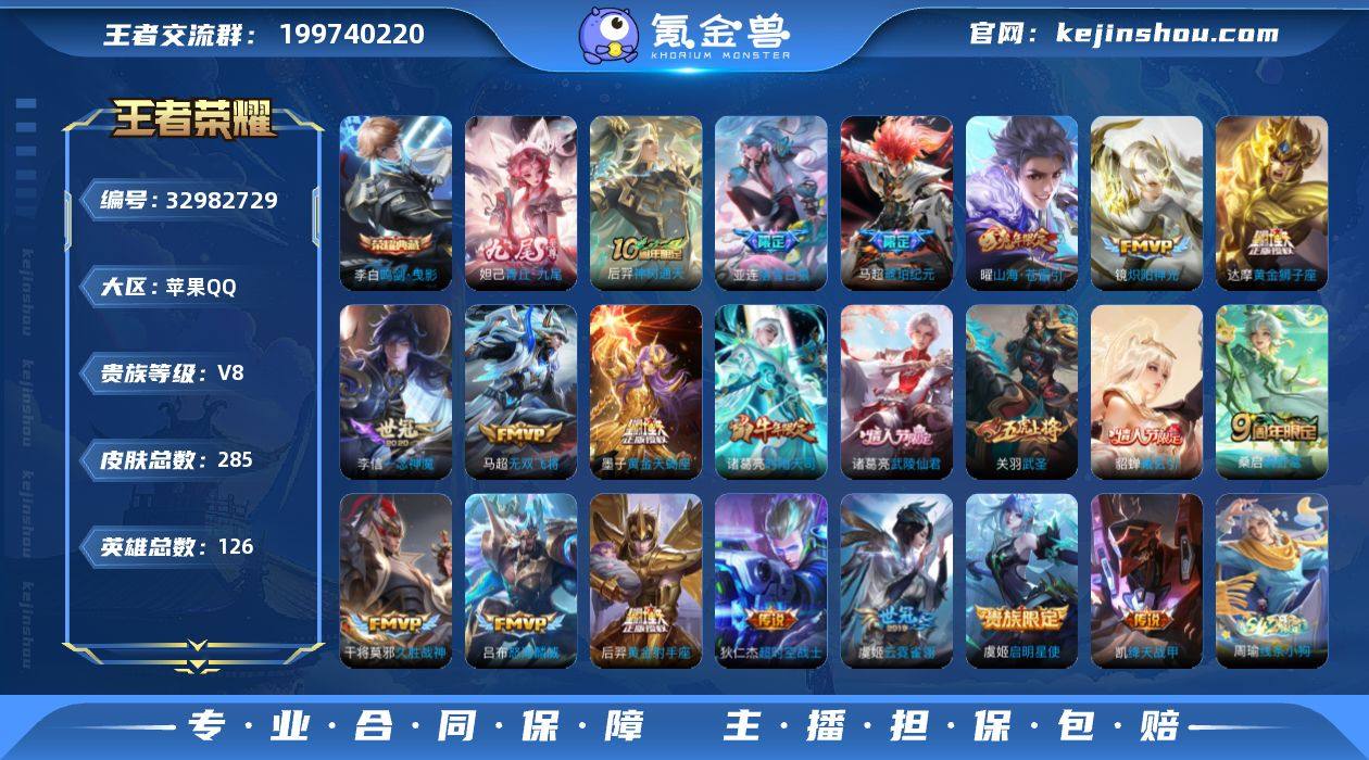 苹果Q-V8-永恒钻石III段位-126英雄-285皮肤-1典藏皮肤-1无双-21传说-82史诗【荣耀典藏】:李白鸣剑曳影【无双皮肤】:妲己青丘九尾【传说皮肤】:后羿神树通天,桑启鸣野蒿,墨子黄金天蝎座,亚连落雪白狼,貂蝉曦玄引,马超琥珀纪元,曜山海苍雷引,吕布怒海麟威,马超无双飞将,诸葛亮时雨天司,铠绛天战甲,镜炽阳神光,虞姬启明星使,关羽武圣,李信一念神魔,干将莫邪久胜战神,虞姬云霓雀翎,达摩黄金狮子座,后羿黄金射手座,诸葛亮武陵仙君,狄仁杰超时空战士【限定皮肤】:白起狰,蔡文姬夏日便利店,虞姬夏日便利店,姜子牙天穹之誓,李白谪仙醉月,狄仁杰阴阳师,赵云皇家上将,赵云引擎之心,孙尚香蔷薇恋人,庄周高山流水,高渐离死亡摇滚,高渐离玩趣恶龙,芈月重明,典韦穷奇,典韦蓝屏警告,马可波罗山海玄木吟,狄仁杰魔术师,狄仁杰万华元夜,达摩沙漠行僧,项羽海滩派对,老夫子航海奇遇记,关羽武圣,程咬金演武夺筹,韩信飞衡,王昭君午后时光,兰陵王金庭之子,花木兰默契交锋,孙悟空至尊宝,孙悟空大圣娶亲,孙悟空孙行者,牛魔御旌,李元芳银河之约,李元芳云中旅人,虞姬启明星使,钟馗驱傩正仪,太乙真人饕餮,鬼谷子原初探秘者,鬼谷子五谷丰年,...