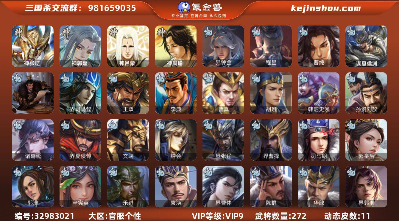 【14789943】官阶:骠骑将军;VIP等级:VIP9;史诗武将数量:16;动态皮肤数量:11;武将总数:272;史诗宝珠数量:0;将魂数量:710;神将:2;魏国史诗武将:8;蜀国史诗武将:3;吴国史诗武将:4;群史诗武将:5