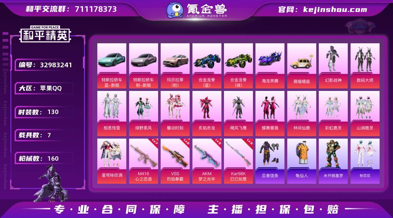 苹果 手Q-12粉装-4特效枪-7载具-2粉色飞行器-59118热力值-7王牌印记-130套装-160枪皮【热门品类】:套装-忍者信条,套装-龟仙人【粉色套装】:粉装-幻影战神,粉装-数码大师,粉装-相思残雪,粉装-绿野柔风,粉装-馨动时刻,粉装-炙焰赤龙,粉装-飓风飞鹰,粉装-蝶舞蔷薇,粉装-林间仙鹿,粉装-彩虹鹿灵,粉装-山涧鹿灵,粉装-星穹咏叹调【粉色枪皮等级】:AKM-梦之光华(五级),M416-心之恋语(七级),Kar98K-巳巳如意(五级),VSS-烈焰拳霸(六级)【粉色载具】:特斯拉Roadster(水滴蓝),特斯拉Roadster(沁心粉),玛莎拉蒂Ghibli(粉),合金龙骨(蓝),合金龙骨(绿),海龙奔腾,萌喵橘座【粉色枪皮】:AKM-梦之光华,M416-心之恋语,Kar98K-巳巳如意,VSS-烈焰拳霸【粉色飞行器】:相思残雪飞行器,林间仙鹿飞行器【粉色降落伞】:香水柠檬降落伞,星之彼岸降落伞,相思残雪降落伞,梦之光华降落伞,烈焰拳霸降落伞,暗夜玫瑰降落伞,林间仙鹿降落伞,星穹咏叹调降落伞【稀有套装】:套装-龟仙人,角色-米开朗基罗,套装-粉恋花,套装-紫幽梦,套装-蓝冰羽,套装-星影赞美诗,套装-蓝海鲸歌【稀有枪皮】:AKM-彩虹符号,AKM-星之彼岸,AKM-破晓战魂,AKM-萌趣颜团子,AK...