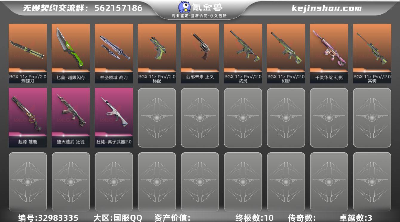 段位: 未定级 套装: RGX 11z Pro//2.0 近战武器皮肤: 匕首-超限闪存,神圣领域 战刀,RGX 11z Pro//2.0 蝴蝶刀 步枪皮肤: 狂徒-堕天遗武,幻影-千灵华绽,幻影-RGX 11z Pro//2.0,狂徒-离子武器2.0 佩枪皮肤: 标配-RGX 11z Pro//2.0,正义-西部未来 狙击枪皮肤: 冥驹-RGX 11z Pro//2.0 冲锋枪皮肤: 骇灵-RGX 11z Pro//2.0 霰弹枪皮肤: 雄鹿-起源 亮点: 【MWW987】【套装】:RGX 11z Pro//2.0套装【英雄】:幻棱,炼狱,维斯,暮蝶,钛狐,壹决,铁臂,捷风,雷兹,幽影,不死鸟,贤者,猎枭,零,芮娜,奇乐,尚勃勒,霓虹,斯凯,夜露,K/O,海神,黑梦,钢锁【近战武器】:近战武器-RGX 11z Pro//2.0 蝴蝶刀,近战武器-超限闪存 匕首,近战武器-生物分子解离器,近战武器-神圣领域 战刀【狂徒】:狂徒-堕天遗武,狂徒-离子武器//2.0【幻影】:幻影-千灵华绽,幻影-RGX 11z Pro//2.0,幻影-超限闪存,幻影-神圣领域【戍卫】:戍卫-浮光跃金,戍卫-月球哨兵【獠犬】:獠犬-神圣领域,獠犬-模拟赫兹【冥驹】:冥驹-RGX 11z Pro//2.0,冥驹-模拟赫兹,冥驹-星云暗涌【莽侠】:莽侠-超限闪存,莽侠-月球哨兵【战神】:战神-神圣领域,战神-浮光跃金【雄鹿】:雄鹿-起源,雄鹿-模拟赫兹...