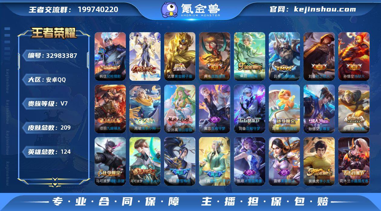 【编号74010 可秒换绑】【店长推荐!极品小号! 韩信典藏弑枪猎影 司空震愿照·山河定 典韦战鼓燎原 吕布怒海麟威刘备时之恋人 刘备百相守梦 马可波罗山海·玄木吟 墨子降魔 韩信傲雪梅枪 孙悟空孙行者 孙悟空至尊宝!!】 安卓Q-V7-永恒钻石III段位-124英雄-209皮肤-1典藏皮肤-7传说-51史诗 【荣耀典藏】:韩信弑枪猎影 【传说皮肤】:司空震愿照山河定,桑启鸣野蒿,典韦战鼓燎原,吕布怒海麟威,刘备时之恋人,达摩黄金狮子座,孙悟空地狱火 【限定皮肤】:蒙犽顽岩魄,姜子牙天穹之誓,狄仁杰阴阳师,赵云皇家上将,墨子降魔,庄周高山流水,高渐离玩趣恶龙,扁鹊奇幻香踪,马可波罗暗影游猎,马可波罗山海玄木吟,狄仁杰魔术师,项羽海滩派对,韩信傲雪梅枪,孙悟空至尊宝,孙悟空孙行者,刘备百相守梦,干将莫邪胡桃夹子,百里玄策原初追逐者,裴擒虎李小龙,裴擒虎擒涛扼浪,蒙犽狂想玩偶喵,鲁班大师探海日志,桑启海盐诗旅,阿古朵江河有灵,张良古海寻踪,高渐离燃音魔法,妲己灵卜魔法,鬼谷子天穹祈灯,沈梦溪龙舞盛年,鲁班七号蔬乡物语,李元芳蔬乡物语,刘邦剑破天穹,程咬金群星魔术团,周瑜熔金海岸 【年限皮肤】:马可波罗山海玄木吟,司空...