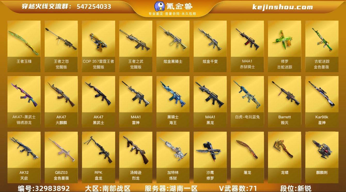 湖南一区-75V-4王者武器数-2炫金武器数 【热门武器】:QBZ03-金色蔷薇,金色蔷薇-古蛇迷踪,修罗-古蛇迷踪,M200-竞技荣光,死亡之眼*4,白虎-电玩蓝兔,Kar98K-星神,C.A.T,炼狱-迷你小钢,毒蜂,汤姆逊-烈龙*6,RPK-盘龙*5,加特林-炼狱,斯泰尔-蝴蝶,裁决-雪莉杨,沙鹰-修罗*4 【王者炫金武器】:王者玉锋,炫金骑士,炫金千变 【音效卡】:烈火-动感闪耀 音效卡,AK47-火麒麟音效卡,M4A1-雷神音效卡,Barrett-毁灭音效卡 【皮肤】:幻神-电竞之星 皮肤,QBZ03-荣耀世冠白鲨,雷神-暗月,雷神-能量核心,雷神-星空,雷神-烈虎皮肤,雷神-源计划2.0专属 皮肤,毁灭-荣耀之怒,毁灭耀金皮肤,毁灭-冠军之怒,毁灭-风暴,黑龙-暗月,战神-紫绶金章皮肤*6,战神-流金岁月皮肤*3,AK47-B-常胜将军-孙权*2,修罗-能量核心*4,修罗-星空,屠龙-荣耀之锋,擎天-冠军之击 【角色】:零,瞳,王者葵-惊若翩鸿,王者炫,蛇隐宗,乔伊教练,幻面灵狐,暗夜-X,初恋灵狐,飞虎队-X,风暴女,嘉年华灵狐,卡塔琳娜,灵狐者-X,龙儿,麻雀,曼陀罗-X,萌儿,潘多拉-X,潘多拉-甜心教官,蛇姬,蜀雪,维纳斯,夜玫瑰-宠粉,樱-战斗天使,影武者-X,游珑儿 【人偶武器】:裁决-雪莉杨,炼...