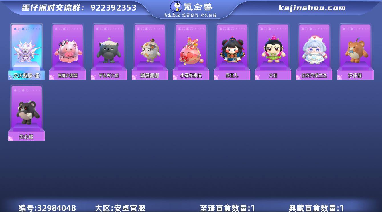 1彩17紫天火麒麟堇平头哥大成喜宝儿刺猬绷绷失心熊仔仔熊恶魔水波蛋 历史潮流:1.8万 段位:完美凤凰蛋 等级:45 性别:男 幻彩套装数量:1 紫色套装数量:17 幻彩套装:天火麒麟堇 紫色套装:双面教师林野 爱神丘比特 平头哥大成 喜宝儿 刺猬绷绷 失心熊 仔仔熊 恶魔水波蛋 提示水波蛋 马尔济斯 暴龙化石斯坦 画中少女格蕾 大娃 花灯兔天 白衣天使兰达 小福袋添运 背饰:业火之翼堇 路易斯西洋棋 玩具:炎拳 鱼篓 随行召唤器 "