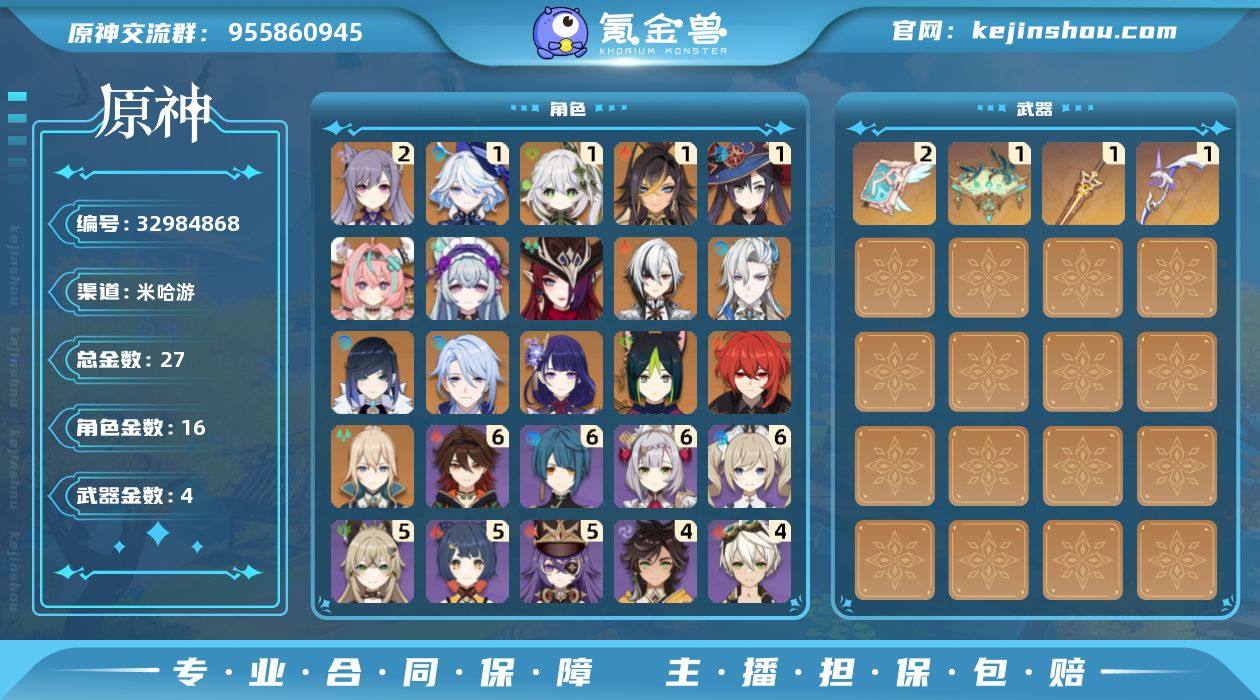 27黄! 冒险等级: 58 2命金色角色: 二命刻晴 1命金色角色: 一命莫娜,一命纳西妲,一命迪希雅,一命芙宁娜 0命金色角色: 迪卢克,琴,雷电将军,神里绫人,夜兰,提纳里,那维莱特,阿蕾奇诺,恰斯卡,梦见月瑞希,瓦雷莎 拥有武器: 天空之卷,阿莫斯之弓,圣显之钥,鹤鸣余音 2精武器: 天空之卷 1精武器: 阿莫斯之弓,圣显之钥,鹤鸣余音