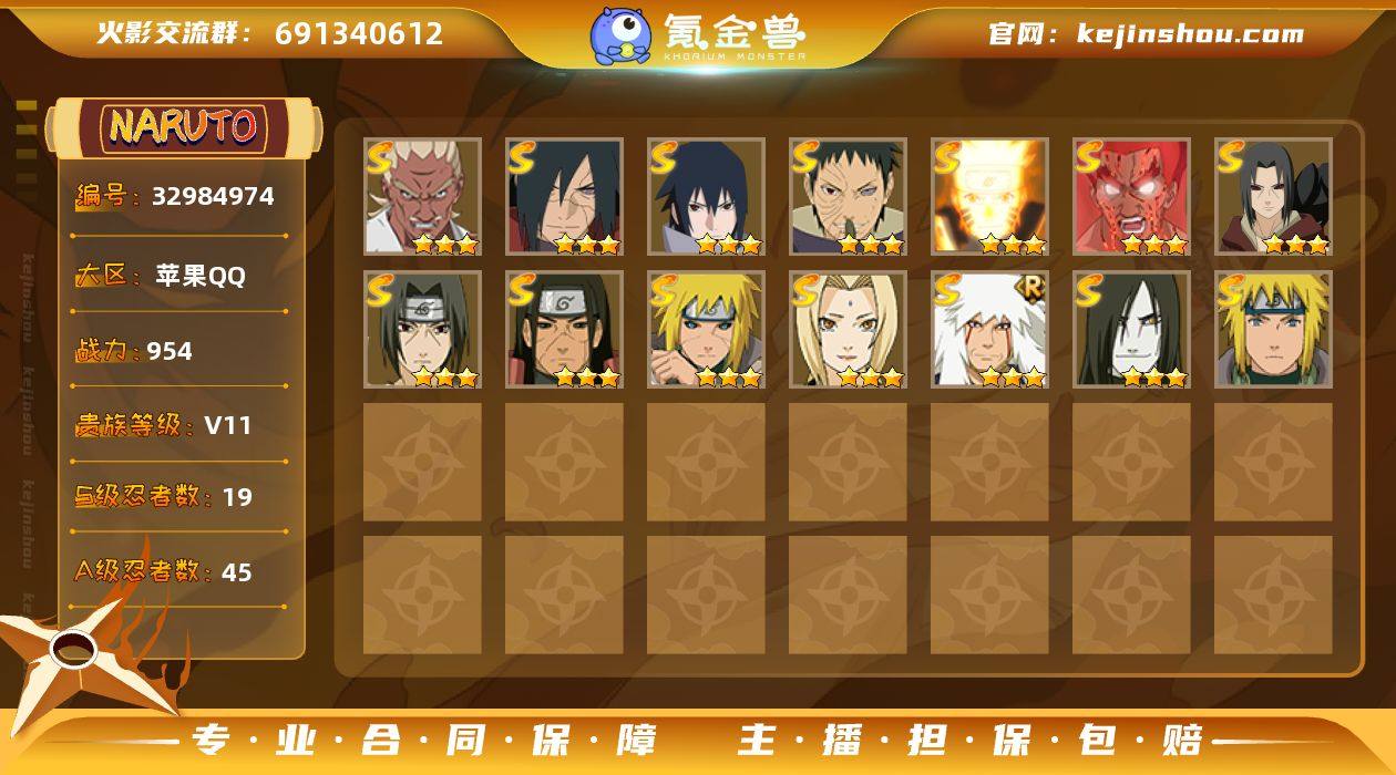 实名: 可修改 贵族等级: V11 S忍数: 19 A忍数: 45 战力值(万): 954 S级忍者: 千手柱间「秽土转生」,宇智波鼬「秽土转生」,波风水门「秽土转生」,大蛇丸,波风水门,纲手,宇智波鼬 「须佐能乎」,迈特凯「死门」,宇智波带土 「忍界大战」,自来也 「舞之豪杰」,漩涡鸣人 「九喇嘛连结」,宇智波佐助「永恒万花筒」,宇智波斑「秽土转生·解」,艾「忍界大战」 通灵兽: 熊猫