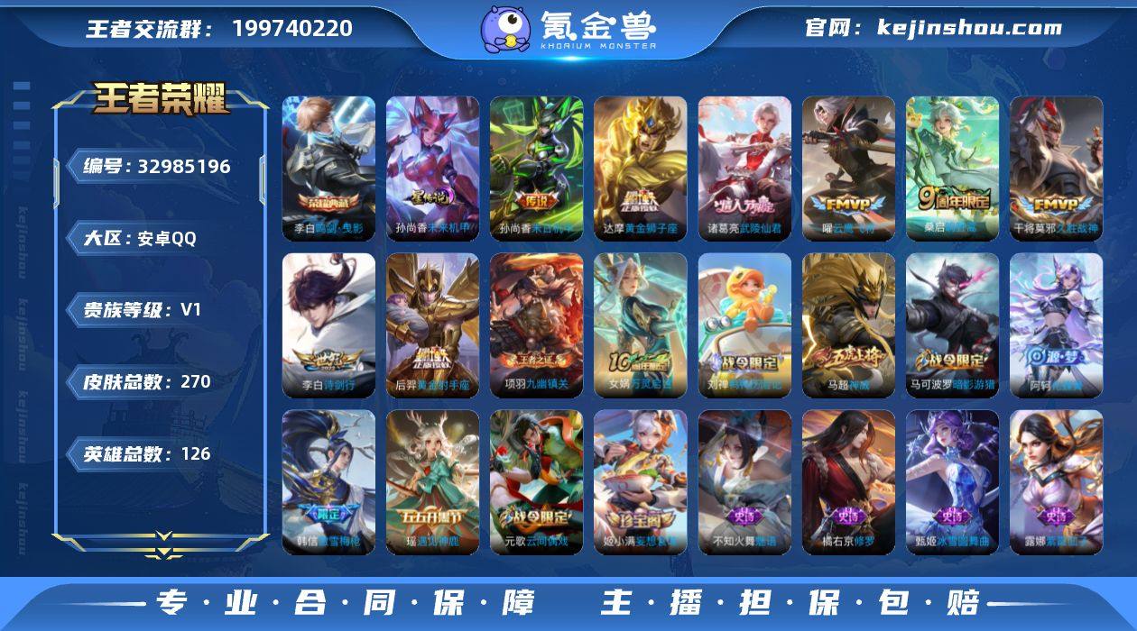 实名: 不可修改 贵族等级: V1 英雄数: 126 皮肤数: 270 荣耀水晶: 鸣剑·曳影 星传说: 未来机甲 传说皮: 黄金狮子座,黄金射手座,云鹰飞将,久胜战神,末日机甲-孙尚香 限定皮: 李小龙,梁祝,神威,武陵仙君,如梦令-后羿,霸王别姬-虞姬,高山流水,匿光追影者,傲雪梅枪,寅虎·心曲,寅虎·展翼,五谷丰年,诗剑行,鸣野蒿 亮点: 【W5477】精品打野号.满铭文(热门皮肤)鸣剑曳影.诗剑行.武陵仙君.黄金狮子座.黄金射手座.傲雪梅枪.安卓Q-不可二次-贵7-126英雄-270皮肤-1典藏-1星元-8传说-79限定-2个性按键.贵族积分4万-营地ID:2127875867(星元皮肤)未来机甲【星元皮肤】:孙尚香未来机甲