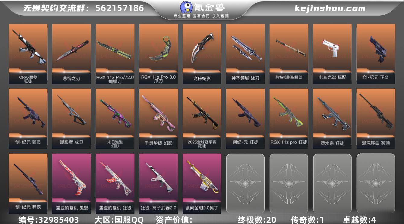 w4884 【性价比】怜悯之刃 颗秒狂徒 25狂徒 泡泡幻影 显卡狂徒 盖亚鬼魅 光谱标配 塑水狂徒 离子狂徒 噬影者戍卫 紫金奥丁 显卡爪刀 盖亚狂徒 混沌大狙 显卡蝴蝶刀 创纪元套 莲花幻影库存: 41050剩余VP:153剩余R点:120 段位:超凡