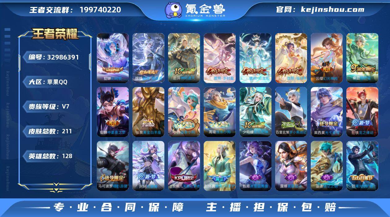 无二次-苹果Q-V7-永恒钻石IV段位-128英雄-211皮肤-1典藏皮肤-1珍品传说-8传说-58史诗 【英雄全皮】:孙权全皮 【荣耀典藏】:貂蝉幻阙歌 【珍品传说】:嫦娥器灵落星盏 【传说皮肤】:后羿神树通天,妲己愿照众生和,蔡文姬愿照福禄聚,虞姬愿照岁时盈,云缨幻光神枪,桑启鸣野蒿,张良黄金白羊座,貂蝉仲夏夜之梦 【限定皮肤】:蔡文姬夏日便利店,虞姬夏日便利店,姜子牙天穹之誓,狄仁杰阴阳师,赵云皇家上将,嬴政优雅恋人,阿轲迷踪丽影,扁鹊奇幻香踪,甄姬落雪兰心,马可波罗暗影游猎,狄仁杰魔术师,达摩沙漠行僧,项羽海滩派对,老夫子醍醐杖,刘邦夺宝奇兵,兰陵王金庭之子,李元芳云中旅人,钟馗驱傩正仪,杨玉环遇见飞天,杨戬潮玩骑兵,蔡文姬繁星吟游,鬼谷子原初探秘者,鬼谷子五谷丰年,弈星混沌棋,明世隐疑决卦,裴擒虎擒涛扼浪,米莱狄胡桃异想国,猪八戒西部大镖客,上官婉儿天狼绘梦者,嫦娥暖冬兔眠,鲁班大师探海日志,桑启海盐诗旅,张良古海寻踪,鬼谷子天穹祈灯,沈梦溪龙舞盛年,芈月浮光幕影,周瑜熔金海岸 【年限皮肤】:妲己愿照众生和,蔡文姬愿照福禄聚,虞姬愿照岁时盈 【赛季限定】:弈星混沌棋,明世隐疑决卦,老夫子醍醐杖,鬼谷子原初探...