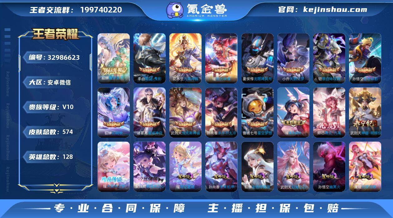 实名: 可修改 贵族等级: V10 英雄数: 128 皮肤数: 574 荣耀水晶: 武则天,天鹅之梦,星空梦想,倪克斯神谕,无限飓风号,杀手不太冷,鸣剑·曳影,全息碎影,星域神启,九霄神辉,银白咏叹调,幻阙歌,拾光映像 无双皮: 真我赫兹(瑶),神器·明辉仪,青丘·九尾 珍品传说: 酷洛米之心,大耳狗之梦 星传说: 时之愿境,幻海之心,未来机甲,幽冥火,金色仲夏夜,无限倾慕 传说皮: 黄金狮子座,黄金射手座,冠军飞将,云鹰飞将,绛天战甲,黄金白羊座,猫影幻舞,久胜战神,炽阳神光,一念神魔,云霓雀翎,末日机甲-孙尚香,地狱火,仲夏夜之梦,音你心动-小乔,零号·赤焰,海洋之心,地狱之眼,飞鸢探春,音你心动-周瑜,胖达荣荣,李逍遥,乞巧织情,时之恋人-刘备,游龙清影,淬星耀世,超时空战士-狄仁杰,遇见胡旋,末日机甲-孙策,花朝如约,挚爱之约,挚爱花嫁,无双飞将,音你闪耀,碎云,神器·狴犴令,神器·明辉仪,山海·炽霜斩,山海·琳琅生,山海·苍雷引,炽翼辉光,燃星之曲,画中仙,浮生妄,记忆之芯,百相守梦(张飞),追逃游戏(亚瑟),追逃游戏(安琪拉),电玩·雷克斯,鹤羽星尊,灼幽烈阳,妄想实况,妄想奇谈,鹤归松栖(云缨),惊梅引,遇见神鼓,鲁班七号-时之奇旅,大乔-时之奇旅,永恒水手月亮,夜礼服假面,小动物乐团,霜月吟,澜逐花归海,艾琳觅芳...