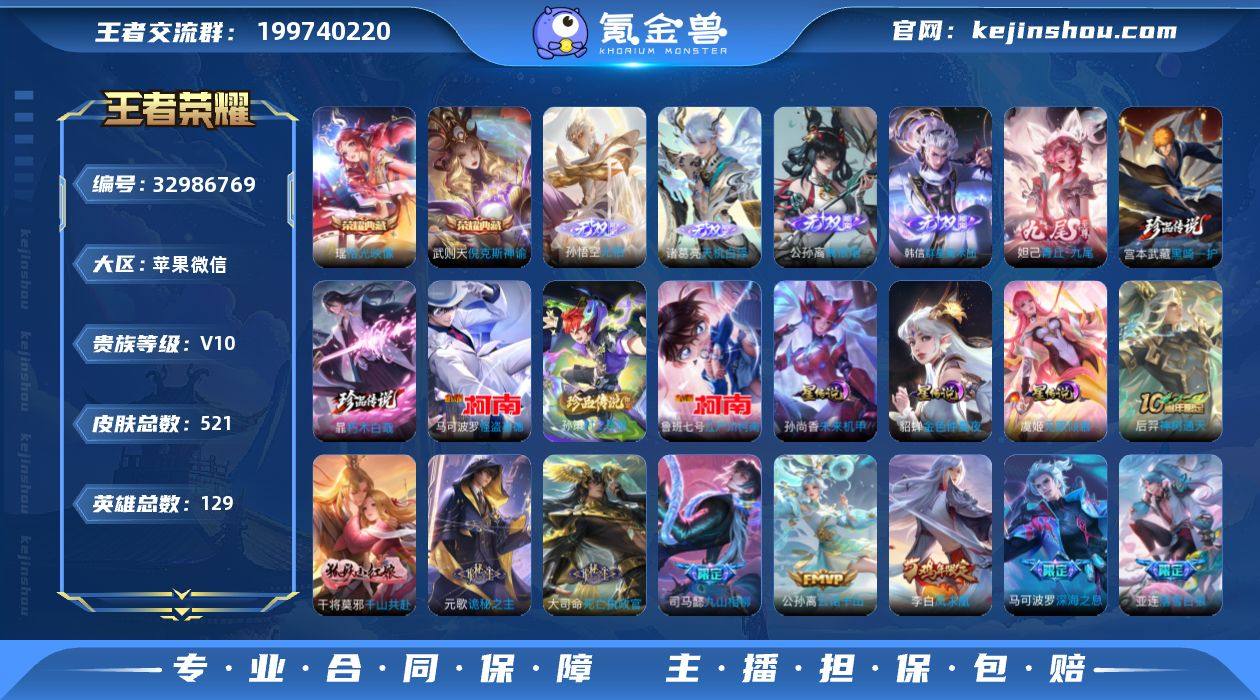 实名: 不可修改 贵族等级: V10 英雄数: 129 皮肤数: 521 荣耀水晶: 武则天,倪克斯神谕,拾光映像 无双皮: 青丘·九尾,韩信群星魔术团,离恨烟,天机白泽,无相 珍品传说: 江户川柯南,怪盗基德,时之奇旅-孙策,朽木白哉,黑崎一护 星传说: 未来机甲,金色仲夏夜,无限倾慕 传说皮: 黄金狮子座,冠军飞将,云鹰飞将,黄金白羊座,猫影幻舞,久胜战神,炽阳神光,一念神魔,末日机甲-孙尚香,仲夏夜之梦,海洋之心,地狱之眼,游龙清影,淬星耀世,花朝如约,挚爱之约,挚爱花嫁,无双飞将,音你闪耀,碎云,神器·狴犴令,山海·琳琅生,燃星之曲,画中仙,浮生妄,记忆之芯,百相守梦(张飞),追逃游戏(安琪拉),电玩·雷克斯,鹤羽星尊,灼幽烈阳,妄想实况,妄想奇谈,鹤归松栖(云缨),惊梅引,鲁班七号-时之奇旅,大乔-时之奇旅,永恒水手月亮,夜礼服假面,小动物乐团,霜月吟,澜逐花归海,艾琳觅芳踪,琥珀纪元铠,琥珀纪元马超,乘龙·问璇玑,乘龙·铭钟鼎,乘龙·淬吴钩,貂蝉曦玄引,典韦战鼓燎原,落雪白狼,金乌负日,黄金天蝎座,云中君群星魔术团,朵莉亚心动手记,牧神诗旅,启明星使,玄雷天君,祥瑞亨通,云诺千山,九山相柳,死亡执政官,诡秘之主,千山共赴,神树通天 限定皮: 游园惊梦,梁祝,时雨天司,引擎之心,白鹤梁神女,蜜橘之夏,逐梦之音,...