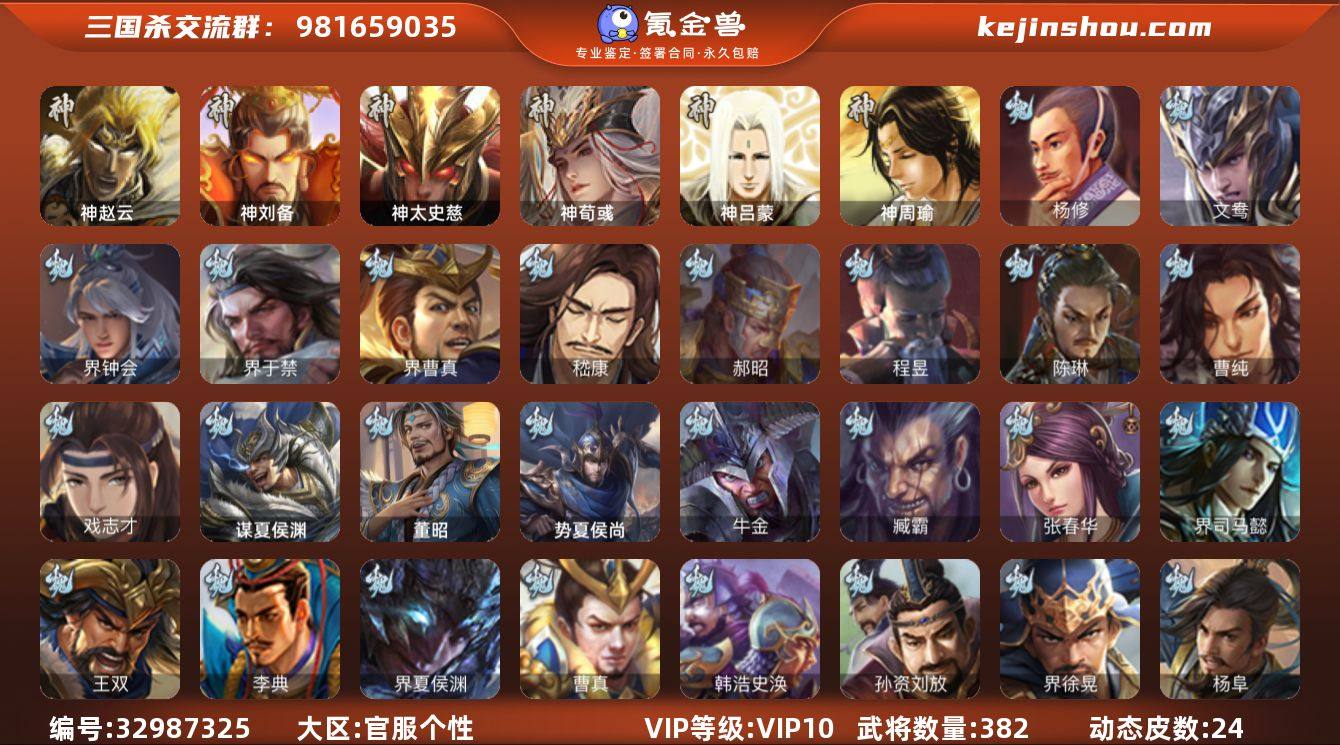 【14789942】官阶:大将军;VIP等级:VIP10;史诗武将数量:44;动态皮肤数量:24;武将总数:382;史诗宝珠数量:0;将魂数量:1521;神将:4;魏国史诗武将:10;蜀国史诗武将:14;吴国史诗武将:6;群史诗武将:11