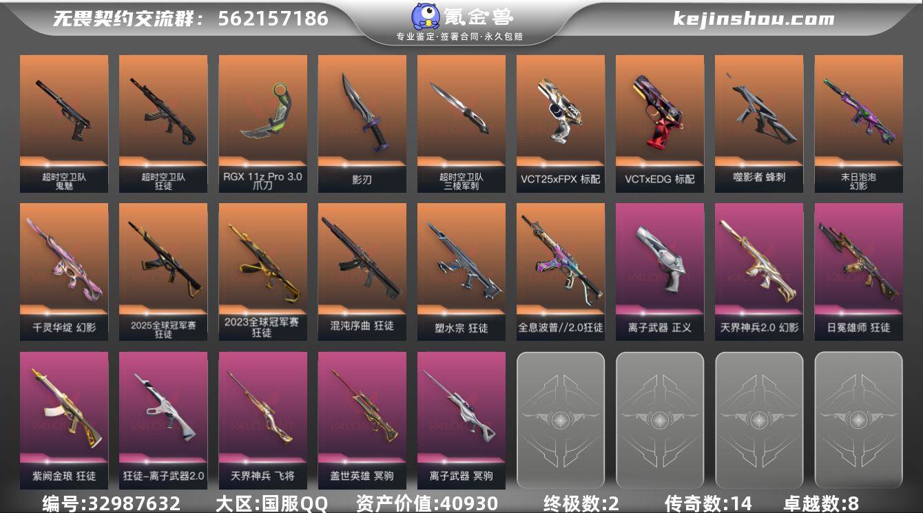 【自带包赔 可赔三倍】:库存价值40930 【限定】: 2025全球冠军赛 狂徒, 2023全球冠军赛 狂徒 【近战】: 超时空卫队 三棱军刺, 影刃, RGX 11z Pro//3.0 爪刀 【狂徒】: 日冕雄师 狂徒, 2025全球冠军赛 狂徒, 塑水宗 狂徒, 超时空卫队 狂徒, 离子武器//2.0 狂徒, 全息波普//2.0 狂徒, 紫阙金琅 狂徒, 混沌序曲 狂徒, 2023全球冠军赛 狂徒 【幻影】: 末日泡泡 幻影, 千灵华绽 幻影, 天界神兵//2.0 幻影 【冥驹】: 离子武器 冥驹, 盖世英雄 冥驹 【正义】: 离子武器 正义 【鬼魅】: 超时空卫队 鬼魅 【标配】: VCT25 x FPX 标配, VCT x EDG 标配 【蜂刺】: 噬影者 蜂刺 【飞将】: 天界神兵 飞将 【概要】: 总皮肤 53 终极2传奇 14卓越 8刀皮3英雄 28 LV296 历史最高:超凡 当前段位:黑铁 已使用1110 R点 剩余0 R点 可二次 卡面、挂饰、其他皮肤请看截图 道具、段位等以实际验号为准。如账号因没有维护,赛季更新等不可抗因素发生变化,不属于账号质量问题"