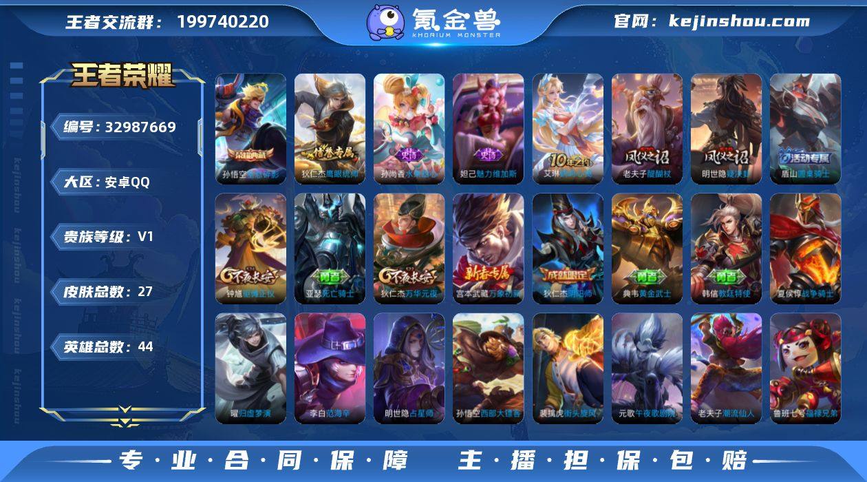 【精品小号·全息碎影·可二次】YXw22039-安卓Q-44英雄-27皮肤-0王者印记-30铭文-贵族积分0w【贵族0】【1典藏】【因赛季更新游戏段付以上号为准!】 【荣耀典藏】:孙悟空全息碎影 【限定皮肤】:狄仁杰阴阳师,狄仁杰万华元夜,老夫子醍醐杖,钟馗驱傩正仪,明世隐疑决卦 【赛季限定】:明世隐疑决卦,老夫子醍醐杖,狄仁杰万华元夜,钟馗驱傩正仪 【史诗皮肤】:狄仁杰鹰眼统帅,妲己魅力维加斯,孙尚香水果甜心 【其他皮肤】:艾琳鹤鸣心笺,钟馗驱傩正仪,狄仁杰万华元夜,老夫子醍醐杖,盾山圆桌骑士,明世隐疑决卦,狄仁杰阴阳师,宫本武藏万象初新,亚瑟死亡骑士,典韦黄金武士,韩信教廷特使,曜归虚梦演,元歌午夜歌剧院,裴擒虎街头旋风,明世隐占星师,夏侯惇战争骑士,刘邦圣殿之光,李白范海辛,兰陵王隐刃,孙悟空西部大镖客,老夫子潮流仙人,鲁班七号木偶奇遇记,鲁班七号福禄兄弟