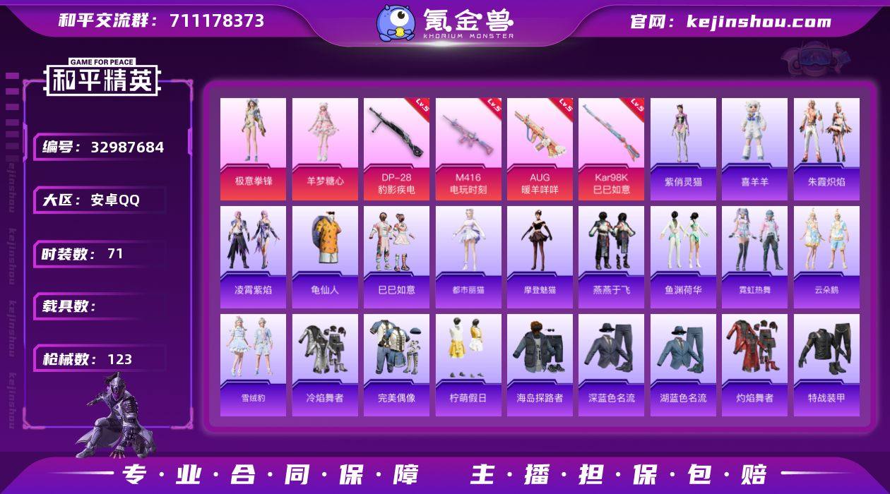 安卓 手Q-2粉装-5特效枪-0载具-1粉色飞行器-29262热力值-1王牌印记-71套装-123枪皮 【热门品类】:套装-龟仙人 【粉色套装】:角色-羊梦糖心,粉装-极意拳锋 【粉色枪皮等级】:M416-电玩时刻(五级),AUG-暖羊咩咩(五级),Kar98K-巳巳如意(五级),Mk14-福马献瑞(五级),DP-28-豹影疾电(五级) 【粉色枪皮】:M416-电玩时刻,AUG-暖羊咩咩,Kar98K-巳巳如意,Mk14-福马献瑞,DP-28-豹影疾电 【粉色飞行器】:炫彩糖果飞行器 【粉色降落伞】:莲影清波降落伞,精灵梦叶罗丽降落伞,千金淑猫降落伞,星穹咏叹调降落伞,荧海星豚降落伞,炫彩糖果降落伞 【稀有套装】:套装-龟仙人,套装-巳巳如意,套装-雪国风尚,套装-炫彩糖果,套装-马上来财,套装-迅捷龙虾,角色-都市丽猫,角色-摩登魅猫,套装-燕燕于飞,套装-鱼渊荷华,套装-霓虹热舞,套装-云朵鹅,套装-雪绒豹,套装-朱霞炽焰,套装-凌霄紫焰,玩偶服-喜羊羊,角色-紫俏灵猫 【稀有枪皮】:AUG-冰晶雪宝,AKM-破晓战魂,M16A4-幻世战舞者,M16A4-红色方程式,SCAR-L-夜灯,SCAR-L-炫彩节奏,SCAR-L-红色方程式,M416-红色方程式,AUG-天降萌叽,AUG-耀粉歌者,M762-云朵鹅,AC-VAL-天降萌叽,蜜獾-天降萌叽,ARX-凌霄紫焰...