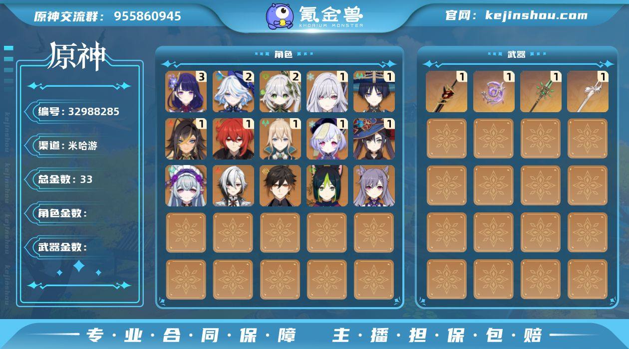 邮箱: 不送邮/死邮 总黄数: 33 冒险等级: 60 3命金色角色: 三命雷电将军 2命金色角色: 二命纳西妲,二命芙宁娜 1命金色角色: 一命迪卢克,一命七七,一命莫娜,一命琴,一命流浪者,一命迪希雅,一命丝柯克 0命金色角色: 刻晴,钟离,提纳里,阿蕾奇诺,梦见月瑞希 1精武器: 和璞鸢,风鹰剑,不灭月华,赤角石溃杵