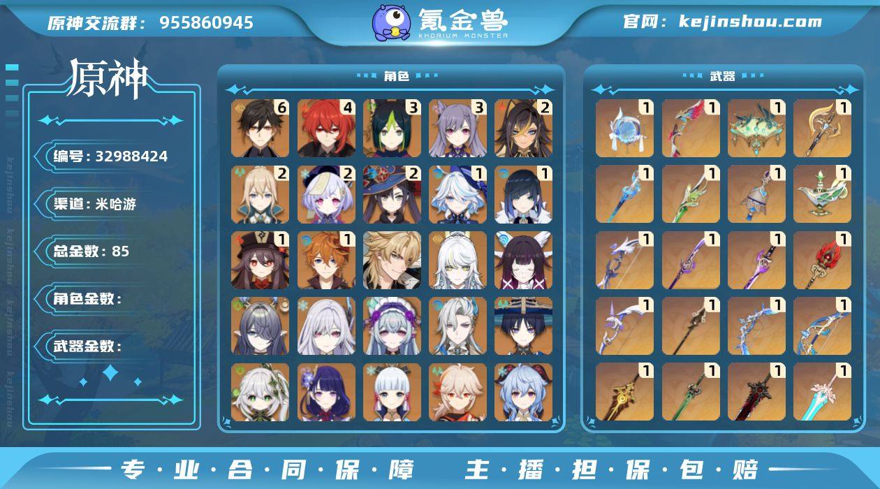 邮箱: 不送邮/死邮 总黄数: 85 冒险等级: 60 6命金色角色: 满命钟离 4命金色角色: 四命迪卢克 3命金色角色: 三命刻晴,三命提纳里 2命金色角色: 二命七七,二命莫娜,二命琴,二命迪希雅 1命金色角色: 一命达达利亚,一命胡桃,一命夜兰,一命芙宁娜 0命金色角色: 温迪,枫原万叶,神里绫华,可莉,阿贝多,甘雨,雷电将军,纳西妲,流浪者,那维莱特,梦见月瑞希,丝柯克,菈乌玛,哥伦比娅,兹白,法尔伽 1精武器: 狼的末路,天空之翼,雾切之回光,四风原典,天空之卷,阿莫斯之弓,天空之傲,天空之刃,无工之剑,贯虹之槊,天空之脊,磐岩结绿,护摩之杖,薙草之稻光,终末嗟叹之诗,冬极白星,若水,千夜浮梦,图莱杜拉的回忆,裁叶萃光,苇海信标,静水流涌之辉,裁断,鹤鸣余音,星鹫赤羽,帷间夜曲