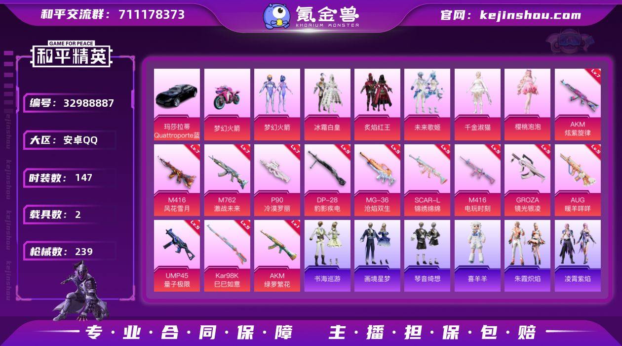 可二次【特价出售/店主推荐】安卓 手Q-7粉装-14特效枪-2载具-3粉色飞行器-74587热力值-12王牌印记-147套装-239枪皮【热门品类】:粉装-梦幻火箭,套装-龟仙人,角色-Mark.06【粉色套装】:粉装-梦幻火箭,粉装-冰霜白皇,粉装-炙焰红王,粉装-未来歌姬,角色-千金淑猫,角色-樱桃泡泡,角色-虎痴许褚【粉色枪皮等级】:AKM-炫紫旋律(七级),AKM-绿萝繁花(一级),SCAR-L-锦绣绵绵(五级),M416-风花雪月(七级),M416-电玩时刻(五级),GROZA-镜光银凌(五级),AUG-暖羊咩咩(五级),M762-激战未来(七级),UMP45-量子极限(五级),AKS-74U-森灵之息(五级),P90-冷漠罗丽(七级),Kar98K-巳巳如意(五级),DP-28-豹影疾电(五级),MG-36-沧焰双生(五级)【粉色载具】:玛莎拉蒂Quattroporte(夜幕蓝),双人摩托-梦幻火箭【粉色枪皮】:AKM-炫紫旋律,AKM-绿萝繁花,SCAR-L-锦绣绵绵,M416-风花雪月,M416-电玩时刻,GROZA-镜光银凌,AUG-暖羊咩咩,M762-激战未来,UMP45-量子极限,AKS-74U-森灵之息,P90-冷漠罗丽,Kar98K-巳巳如意,DP-28-豹影疾电,MG-36-沧焰双生【粉色飞行器】:炫彩糖果飞行器,梦幻火箭飞行器,极意拳锋飞行器