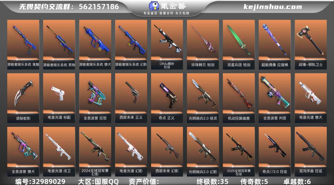 【套装】:源能者娱乐系统套装,电音光谱套装,西部未来套装,全息波普套装,耀鳞威龙套装 【英雄】:幻棱,炼狱,维斯,暮蝶,钛狐,壹决,铁臂,捷风,雷兹,幽影,不死鸟,贤者,猎枭,蝰蛇,零,芮娜,奇乐,尚勃勒,霓虹,斯凯,夜露,星礈,K/O,海神,盖可,黑梦,钢锁 【近战武器】:近战武器-魔术火花,近战武器-谐波音谱,近战武器-威龙之刃,近战武器-未来开拓者,近战武器-珍珠棘贝 短剑,近战武器-流星兵团 短剑,近战武器-超能偶像 应援棒,近战武器-钢轨卫士 战锤,近战武器-街机高手,近战武器-全息匕首,近战武器-诡秘蛇影 军刀,近战武器-魔术火花 【狂徒】:狂徒-2025全球冠军赛,狂徒-洪荒怒焰,狂徒-混沌序曲,狂徒-机动狂飙,狂徒-奇点//2.0,狂徒-全息波普//2.0,狂徒-ORA x 颗秒,狂徒-掠影,狂徒-耀鳞威龙,狂徒-紫阙金琅,狂徒-超能偶像,狂徒-钢轨卫士,狂徒-流星兵团,狂徒-诡秘蛇影 【幻影】:幻影-2024全球冠军赛,幻影-光明哨兵//2.0,幻影-西部未来,幻影-电音光谱,幻影-源能者娱乐系统,幻影-珍珠棘贝,幻影-聚合之力,幻影-战术小伙伴,幻影-末日之翼,幻影-西部未来,幻影-电音光谱 【戍卫】:戍卫-电音光谱,戍卫-超能偶像,戍卫-钢轨卫...