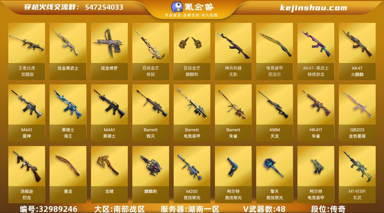 湖南一区-51V-1王者武器数-2炫金武器数 【热门武器】:QBZ03-金色蔷薇,M14EBR-玄武,HK417-朱雀*2,M4A1-青龙,M200-竞技荣光,M4A1-黑骑士,汤姆逊-烈龙,USP-雷暴 【王者炫金武器】:炫金武士,炫金修罗 【音效卡】:M4A1-黑骑士音效卡,炼狱-百战金芒-庆典舞曲音效卡 【皮肤】:雷神-暗月,雷神-机甲刑天皮肤,雷神-源计划2.0专属 皮肤,M4A1-再燃火线,火麒麟-雷神,火麒麟-平天大圣*2,火麒麟-心动糖果,毁灭-青帝,黑骑士-暗月,战神-紫绶金章皮肤,轻型军用手斧-再燃火线 【角色】:魅影,电竞教官-云悠悠,乔伊教练,修道士,空,暗夜-X,初恋灵狐,飞虎队-X,风暴女,嘉年华灵狐,兰-新年限定,曼陀罗-X,邱刚敖,斯沃特-X,蜀雪,新娜塔莎,雪莉杨,樱-战斗天使,影武者-X 【人偶武器】:天龙-曼陀罗,火麒麟-灵狐,M4A1-雷神-精英刀锋,AWM-灵狐-15周年嘉年华,M37-葵,夺魂,生化手雷-机甲核心,Barrett-夜玫瑰,M200-夜玫瑰 【暴走生化】:超级对讲机 【挑战大师】:冰龙粉碎者-白马银枪,激光毁灭者III-白马银枪,神圣爆裂者-末日III 【英雄级武器】:AK47-火麒麟*2,M4A1-雷神*2,M4A1-黑骑士,M4A1-青龙,HK417-朱雀*2,M14EBR-玄武,无影-神兵利器,黑武士-...