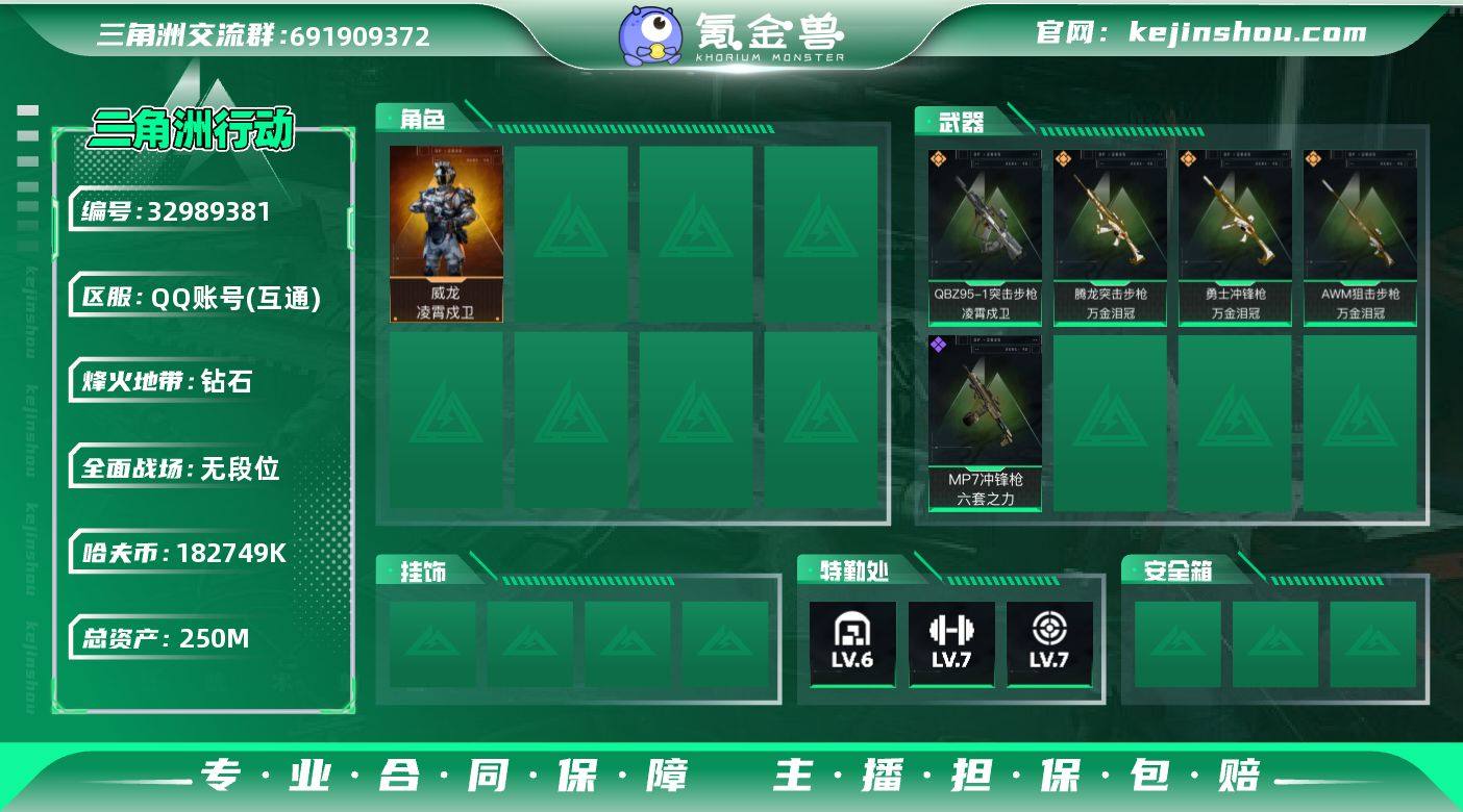 【SJ1593】250m总资产-182749k哈夫币-60烽火等级-钻石-1战场等级-无军衔 【干员外观】:威龙-凌霄戍卫 【近战皮肤】:近战-黑鹰 【传说外观】:QBZ95-1突击步枪-凌霄戍卫,AUG突击步枪-悠然茶歇,腾龙突击步枪-万金泪冠,MK47突击步枪-悠然茶歇,UZI冲锋枪-悠然茶歇,勇士冲锋枪-万金泪冠,QCQ171冲锋枪-不羁人生,AWM狙击步枪-万金泪冠 【史诗外观】:MP7冲锋枪-六套之力,QJB201轻机枪-炽焰 【稀有外观】:野牛冲锋枪-千里骏骨,AS Val突击步枪-休闲时光,SG552突击步枪-贴花艺术,SMG-45冲锋枪-行动开启,SMG-45冲锋枪-幻影结构,QJB201轻机枪-哈夫克卫队,SV-98狙击步枪-星链科技,SV-98狙击步枪-哈夫克航天,SV-98狙击步枪-精英联盟,QSZ92G-一帆风顺 【普通外观】:M4A1突击步枪-高雅黑,QBZ95-1突击步枪-海浪,K416突击步枪-几何迷彩,K416突击步枪-高雅黑,M7战斗步枪-黑巧甜心,SG552突击步枪-狂欢,SCAR-H战斗步枪-数码迷彩,CAR-15突击步枪-狂欢,MP5冲锋枪-黄蜂,Vector冲锋枪-几何迷彩,UZI冲锋枪-狂欢,M1014霰弹枪-高雅黑,M1014霰弹枪-海浪,M1014霰弹枪-重击,杠杆式步枪-出货,QJB201轻机枪-典雅 【挂饰】:挂饰-凌霄戍卫,挂饰-福禄*3,挂饰-聚宝盆*4,挂...