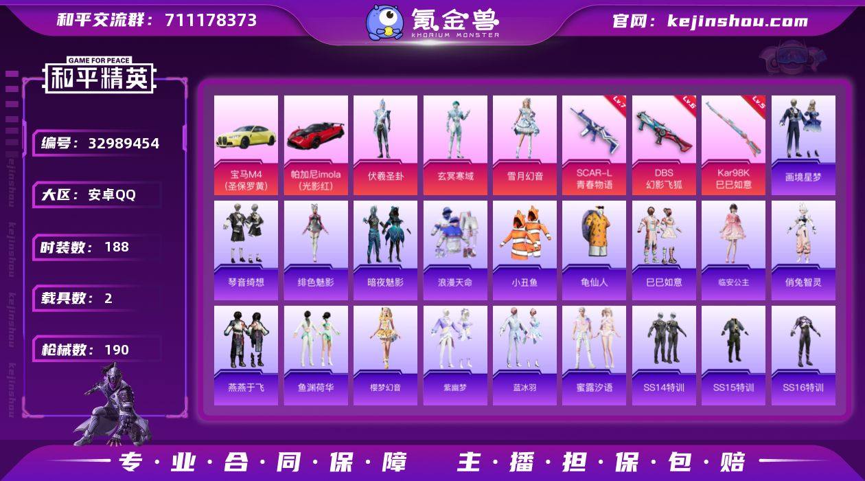 战队服安卓 手Q-4粉装-6特效枪-2载具-2粉色飞行器-63173热力值-15王牌印记-188套装-190枪皮 【热门品类】:套装-浪漫天命,套装-小丑鱼,套装-龟仙人 【粉色套装】:角色-伏羲圣卦,角色-玄冥寒域,粉装-雪月幻音,角色-虎痴许褚 【粉色枪皮等级】:SCAR-L-青春物语(七级),UMP45-萌骑冒险(五级),AKS-74U-森灵之息(五级),Kar98K-巳巳如意(五级),Mk14-福马献瑞(四级),DBS-幻影飞狐(六级) 【粉色载具】:宝马M4(圣保罗黄),帕加尼imola(光影红) 【粉色枪皮】:SCAR-L-青春物语,UMP45-萌骑冒险,AKS-74U-森灵之息,Kar98K-巳巳如意,Mk14-福马献瑞,DBS-幻影飞狐 【粉色飞行器】:炫彩糖果飞行器,极意拳锋飞行器 【粉色降落伞】:百万伏特降落伞,星之彼岸降落伞,蓝莓炮弹降落伞,筑梦精灵降落伞,旋转彩虹降落伞,炫光之旅降落伞,金丰海韵降落伞,雪月幻音降落伞,圣域龙灵降落伞,炫彩糖果降落伞,虎痴许褚降落伞 【稀有套装】:套装-龟仙人,套装-巳巳如意,套装-雪国风尚,角色-临安公主,角色-俏兔智灵,套装-燕燕于飞,套装-鱼渊荷华,套装-樱梦幻音,套装-紫幽梦,套装-蓝冰羽,套装-蜜露汐语,角色-绯色魅影,套装-画境星梦,套装-琴音绮想,套装-雨过天青,...