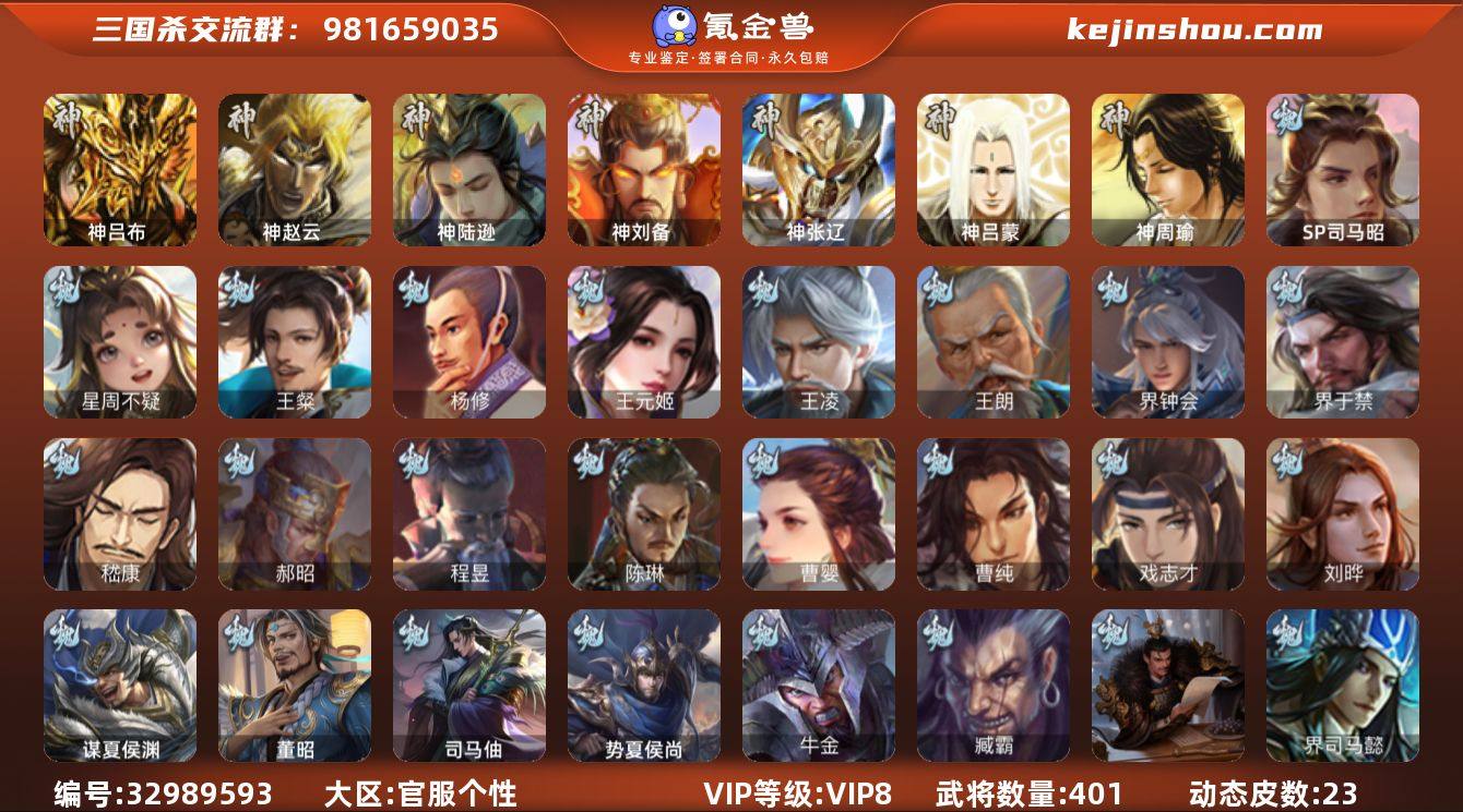 【4801】官阶:大将军;VIP等级:VIP8;史诗武将数量:64;动态皮肤数量:23;武将总数:401;史诗宝珠数量:0;将魂数量:390432;神将:5;魏国史诗武将:16;蜀国史诗武将:12;吴国史诗武将:6;群史诗武将:24
