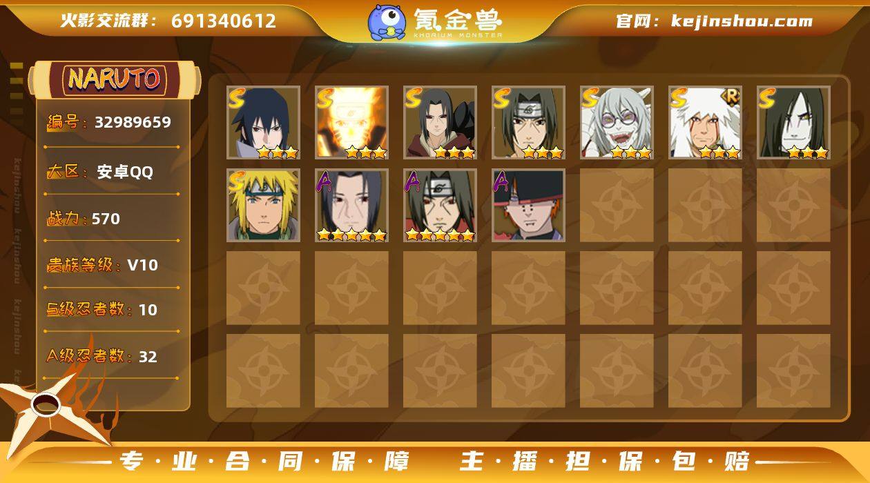 实名: 可修改 贵族等级: V10 S忍数: 10 A忍数: 32 战力值(万): 570 S级忍者: 宇智波鼬「秽土转生」,药师兜「仙人模式」,大蛇丸,波风水门,宇智波鼬 「须佐能乎」,自来也 「舞之豪杰」,漩涡鸣人 「九喇嘛连结」,宇智波佐助「永恒万花筒」 热门A级忍者: 佩恩·六道「漂泊浪客」