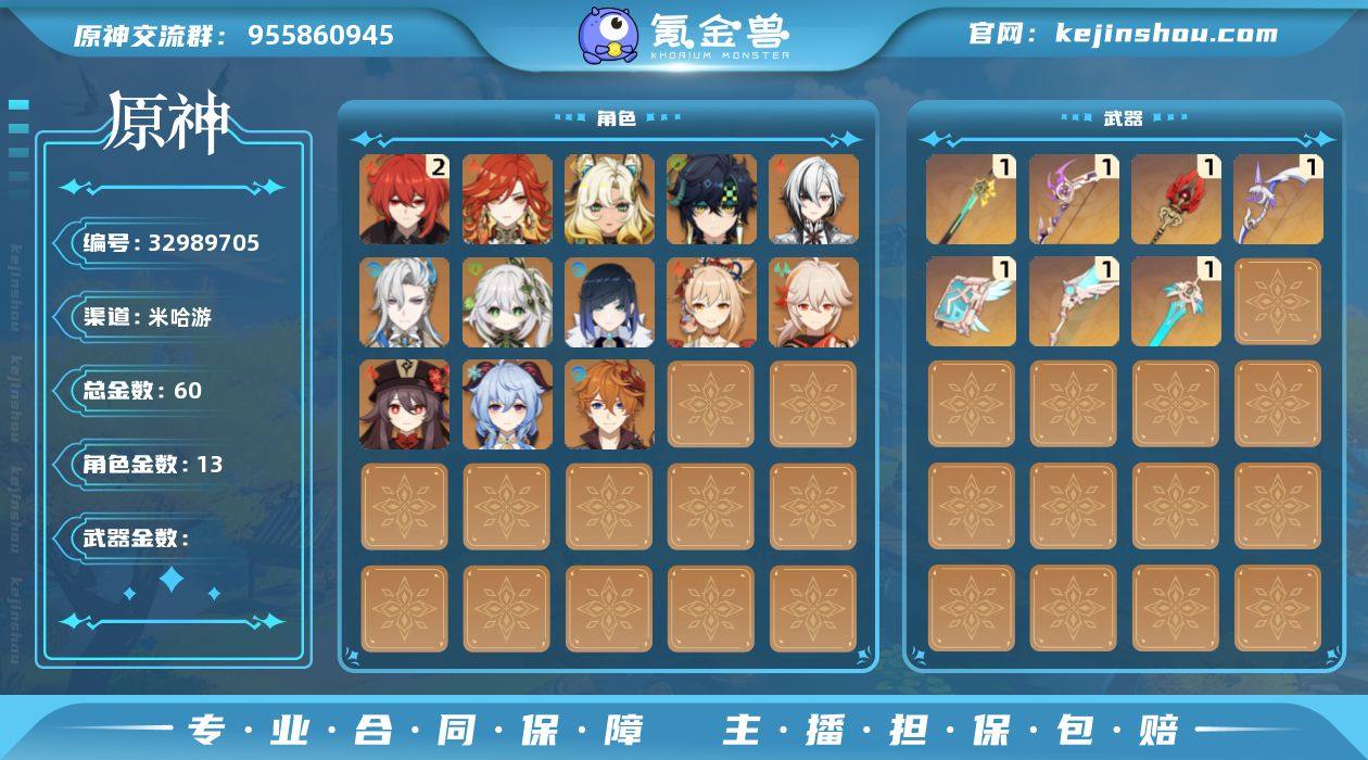 60黄 风元素:0命枫原万叶, 0命魈 火元素:0命玛薇卡, 0命阿蕾奇诺, 0命宵宫, 0命胡桃, 0命可莉 水元素:0命那维莱特, 0命夜兰, 0命达达利亚, 0命珊瑚宫心海 雷元素:6命雷电将军 冰元素:0命爱可菲, 0命丝柯克, 0命甘雨, 0命埃洛伊 岩元素:0命希诺宁, 0命钟离 草元素:0命纳西妲, 0命基尼奇 【常驻五星角色及命座】 风元素:3命琴 火元素:2命迪卢克, 1命迪希雅 水元素:2命莫娜 雷元素:0命刻晴 冰元素:3命七七 草元素:0命提纳里 单手剑:精1天空之刃, 精1岩峰巡歌, 精3风鹰剑 双手剑:精1狼的末路 长柄武器:精1护摩之杖, 精1薙草之稻光 法器:精1天空之卷, 精1溢彩心念, 精1神乐之真意 弓:精1天空之翼, 精1阿莫斯之弓, 精1飞雷之弦振, 精1飞雷之弦振, 精1飞雷之弦振 【角色皮肤】 五星角色:甘雨-玄玉瑶芳 四星角色:香菱-岁夜欢哗, 凝光-纱中幽兰, 菲谢尔-极夜真梦, 行秋-雨化竹身, 丽莎-叶隐芳名