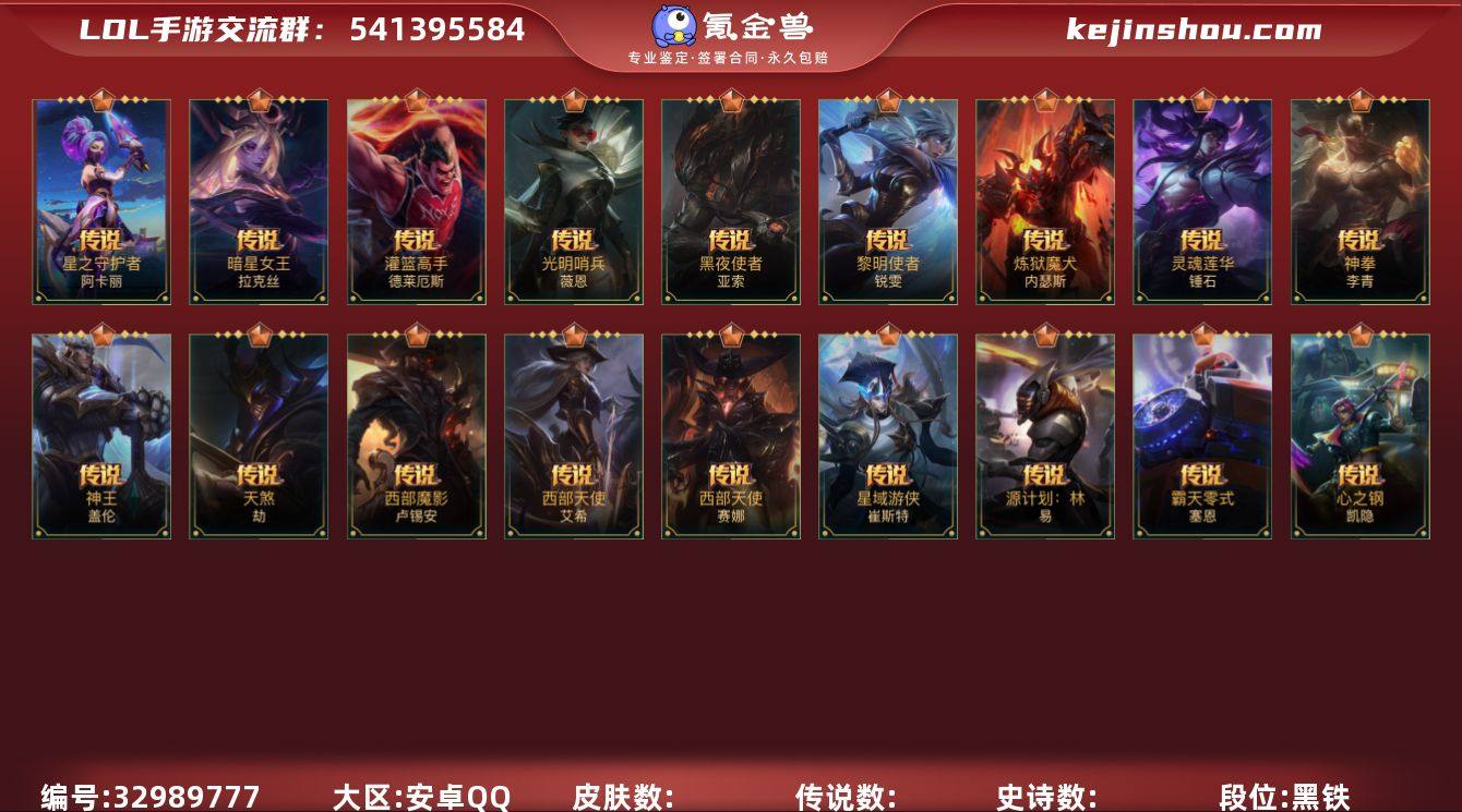 实名: 可修改 段位: 黑铁 传说皮: 灌篮高手,光明哨兵薇恩,黑夜使者亚索,黎明使者锐雯,炼狱魔犬,神拳盲僧,神王盖伦,天煞劫,西部魔影卢锡安,西部天使寒冰,西部天使赛娜,星域游侠卡牌,灵魂莲华锤石,源计划:林,暗星女王拉克丝,霸天零式塞恩,心之钢凯隐,星之守护者 阿卡丽