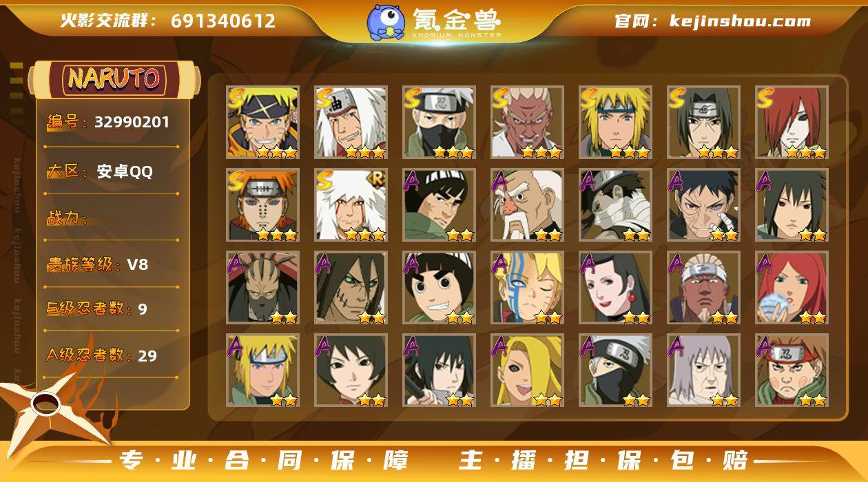 实名: 不可修改 贵族等级: V8 S忍数: 9 A忍数: 29 亮点: 账号亮点:长门「秽土转生」(3星),艾「忍界大战」(3星),宇智波鼬「须佐能乎」(3星),旗木卡卡西「须佐能乎」(3星),自来也「舞之豪杰」(3星),自来也「传说中的三忍」(3星),波风水门(3星),佩恩「天道」(3星),漩涡鸣人·宇智波佐助(3星)240【S级忍者】:长门「秽土转生」(3星),艾「忍界大战」(3星),宇智波鼬「须佐能乎」(3星),旗木卡卡西「须佐能乎」(3星),自来也「舞之豪杰」(3星),自来也「传说中的三忍」(3星),波风水门(3星),佩恩「天道」(3星),漩涡鸣人·宇智波佐助(3星)【A级忍者】:艾「青年」(2星),波风水门「青年」(2星),迪达拉「秽土转生」(2星),大蛇丸「晓」(2星),飞段(2星),飞段「死司凭血」(2星),干柿鬼鲛(2星),漩涡博人「桃式显现」(2星),迈特凯(2星),旗木卡卡西「忍界大战」(2星),桃地再不斩「秽土转生」(2星),我爱罗「疾风传」(2星),蝎(2星),蝎「绯流琥」(2星),小南「神驹佑将」(2星),角都「秽土转生」(2星),猿飞阿斯玛(2星),宇智波佐助「须佐能乎」(2星),宇智波佐助「万花筒写轮眼」(2星),宇智波带土「漂泊浪客」(2星),李洛克「忍界大战」(2星),黑土「博人传」(2星),秋...