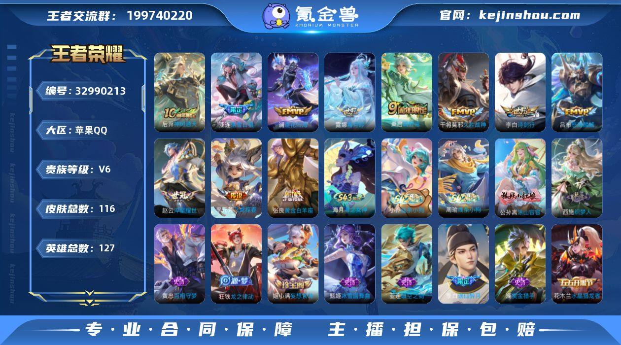 【V6对抗路男神号·11传说·116皮肤·低价出】苹果Q-V6-永恒钻石II段位-127英雄-116皮肤-11传说-31史诗 【传说皮肤】:后羿神树通天,桑启鸣野蒿,亚连落雪白狼,澜逐花归海,露娜霜月吟,吕布怒海麟威,李白诗剑行,赵云淬星耀世,李元芳飞鸢探春,张良黄金白羊座,干将莫邪久胜战神 【限定皮肤】:姜子牙天穹之誓,李白谪仙醉月,狄仁杰阴阳师,赵云皇家上将,狄仁杰魔术师,项羽海滩派对,李元芳云中旅人,裴擒虎擒涛扼浪,嫦娥暖冬兔眠,桑启海盐诗旅,暃星界游侠,张良古海寻踪,鬼谷子天穹祈灯,姬小满妄想食味,亚连落雪白狼,刘邦剑破天穹 【赛季限定】:李元芳云中旅人,桑启海盐诗旅,裴擒虎擒涛扼浪,张良古海寻踪,鬼谷子天穹祈灯,刘邦剑破天穹,姜子牙天穹之誓,东皇太一噬灭天穹,钟馗虚灵犬护,甄姬逆浪荇歌,亚瑟荣光之誓 【战令限定】:暃星界游侠,嫦娥暖冬兔眠,亚连破空之剑,孙悟空神迹守卫,周瑜线条小狗,小乔线条小狗 【史诗皮肤】:周瑜线条小狗,小乔线条小狗,公孙离涂山容容,西施织梦人,黄忠百相守梦,狂铁龙之律动,李白谪仙醉月,亚连破空之剑,姬小满妄想食味,暃星界游侠,澜赏金猎手,小乔青蛇,狄仁杰鹰眼统帅,大乔猫狗日记,李元芳逐浪之...
