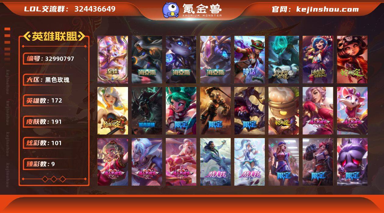 未定级段位-172英雄-191皮肤-101炫彩-0终极-8神话-37限定-19传说-38史诗 【神话皮肤】:十周年纪念安妮,源代码乐芙兰,十五周年纪念希维尔,神凰行者瑞羽圣凰艾尼维亚 【至臻皮肤】:至臻太空律动节奏幻师璐璐 【海克斯皮肤】:新创战纪希维尔,海克斯科技波比,海克斯科技克格莫 【臻彩皮肤】:雾雨之刃锐雯,玉剑传说无极麒麟,玉剑传说无影竞星,星之守护者金克丝黑洞,幻灵战斗蝠薇恩梦幻强袭,魔女阿卡丽虚荣,水晶玫瑰斯维因纯洁花蕾,幽梦玫瑰伊莉丝浪漫花蕾 【年限皮肤】:你看见过我的熊猫吗安妮,春晖神女拉克丝,点心宝贝阿木木 【情人节限定】:甜心宝贝安妮,甜心宝贝娑娜,甜心之翎洛,穿心之剑菲奥娜,觅心之翼奎因,觅心游侠卢锡安,觅心猫猫悠米,觅心女王艾希,幽梦玫瑰辛德拉,幽梦玫瑰伊莉丝,水晶玫瑰迦娜,水晶玫瑰阿克尚 【冰雪限定】:圣诞开心鬼提莫,圣诞狂欢基兰 【限定皮肤】:暗裔英雄盖伦,胜利之剑亚托克斯,胜利枪神卢锡安,胜利凤凰艾尼维亚,胜利之王泰达米尔,胜利巨口克格莫,胜利女神娑娜,胜利剑圣易,胜利之运崔斯特,胜利女神菲奥娜,魅惑女巫崔丝塔娜,泳池派对凯特琳,怦然心动凯特琳,黯然心伤阿木木,暗影沃里克,意乱情迷蔚,...