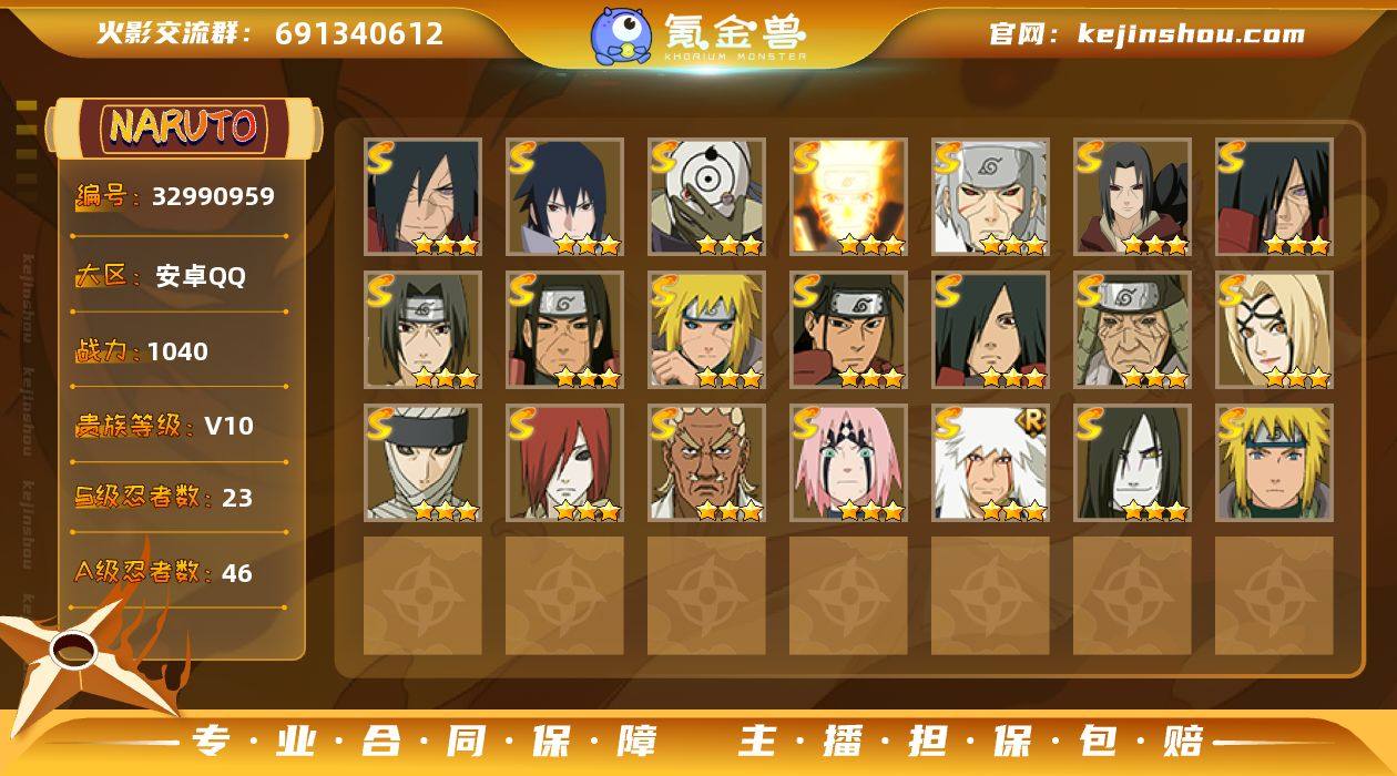 [18002501]V10 23S忍 46A忍 16通灵 1040.1W战力 可二次 可修改实名 【S级忍者】宇智波斑「秽土转生·解」,宇智波佐助「永恒万花筒」,春野樱 「忍界大战」,漩涡鸣人 「九喇嘛连结」,千手柱间「秽土转生」,自来也 「舞之豪杰」,波风水门「九喇嘛连结」,漩涡鸣人·宇智波佐助,宇智波鼬「秽土转生」,宇智波斑「秽土转生」,宇智波斑「白面具」,千手扉间「秽土转生」,纲手「百豪」,波风水门「秽土转生」,无「二代目土影」,猿飞日斩「秽土转生」,长门「秽土转生」,宇智波斑,千手柱间,艾「四代目雷影」,宇智波鼬 「须佐能乎」,波风水门,大蛇丸
