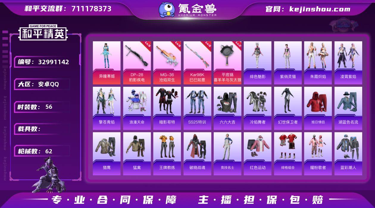 极品小号 安卓 手Q-1粉装-4特效枪-0载具-1粉色飞行器-18315热力值-4王牌印记-56套装-62枪皮【热门品类】:套装-浪漫天命,套装-暗影哥特【粉色套装】:角色-异瞳寒姬【粉色枪皮等级】:Kar98K-巳巳如意(五级),DP-28-豹影疾电(五级),MG-36-沧焰双生(五级),平底锅-喜羊羊与灰太狼(二级)【粉色枪皮】:Kar98K-巳巳如意,DP-28-豹影疾电,MG-36-沧焰双生,平底锅-喜羊羊与灰太狼