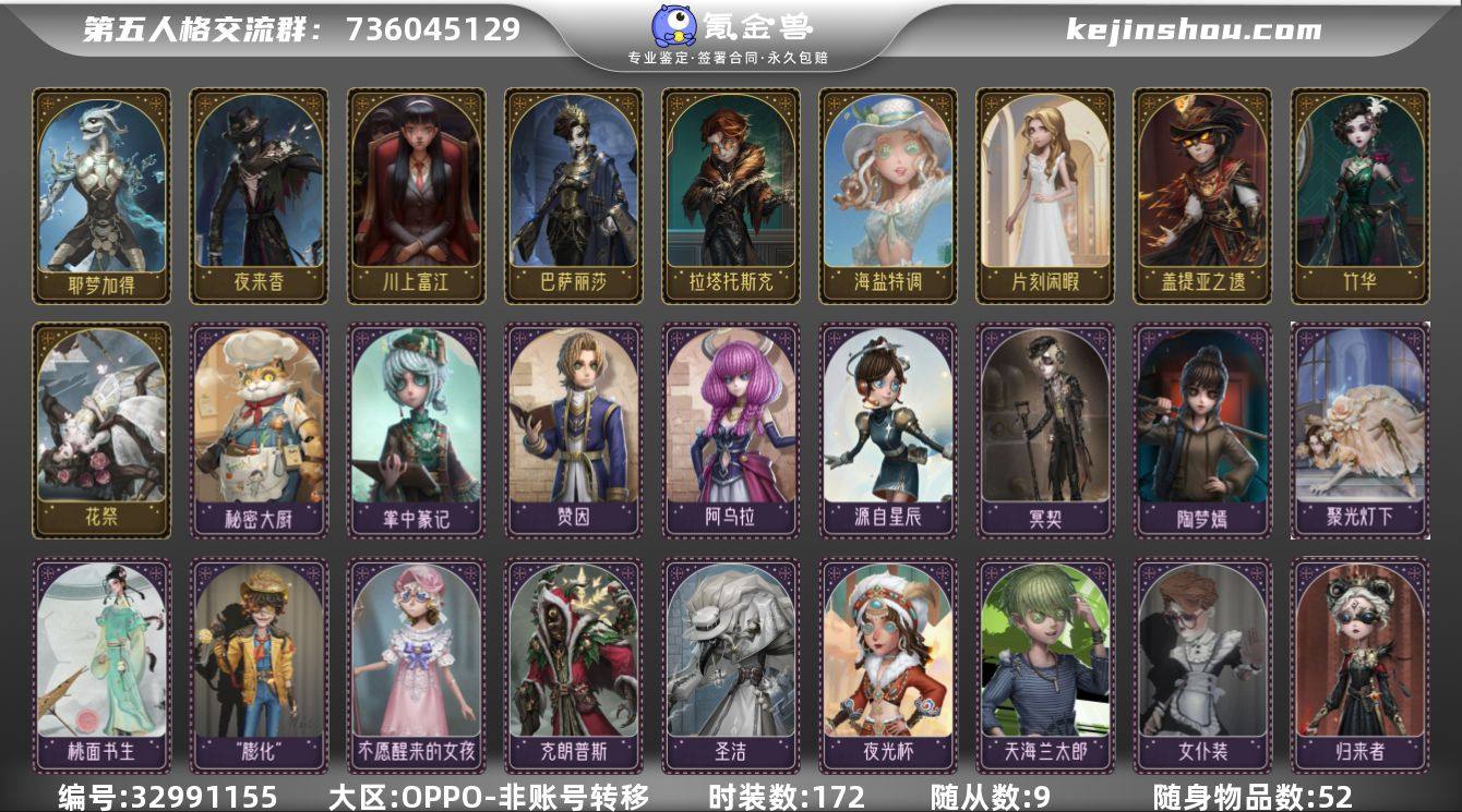 账号类型: 手机账号 时装数: 172 时装: 爱哭鬼-被时间遗忘的男孩,红蝶-竹华,“杰克”-绿纹大触,“杰克”-夜来香,机械师-归来者,祭司-神圣之辉,祭司-梦之使者,鹿头-蒸汽朋克,盲女-不愿醒来的女孩,梦之女巫-川上富江,“使徒”-校监夫人,调酒师-海盐特调,幸运儿-女仆装,幸运儿-拉塔托斯克,佣兵-白鹰之舞,蜘蛛-花祭,“噩梦”-圣洁,歌剧演员-巴萨丽莎,“囚徒”-天海兰太郎,调酒师-夜光杯,守夜人- 隐形人,黄衣之主-克朗普斯,勘探员-盖提亚之遗,爱丽丝·德罗斯-片刻闲暇,爱哭鬼-摩诺,机械师-纸心,火灾调查员-“膨化”,宿伞之魂-桃面书生,蜘蛛-聚光灯下,孽蜥-耶梦加得,古董商-陶梦嫣,守墓人-冥契 ,园丁-源自星辰,祭司-阿乌拉,冒险家-赞因,画家-掌中篆记,26号守卫-秘密大厨