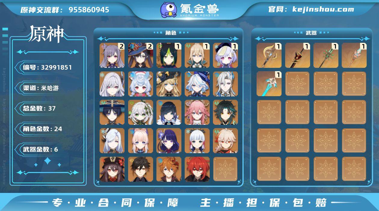 60级/37黄/男主/24个五星角色/6个五星武器 0命希格雯,0命娜维娅,0命芙宁娜,0命那维莱特,0命流浪者,0命纳西妲,1命提纳里,0命夜兰,0命八重神子,0命申鹤,0命雷电将军,0命枫原万叶,0命神里绫华,0命钟离,0命胡桃,0命魈,0命达达利亚,0命珊瑚宫心海,2命刻晴,1命七七,1命琴,2命莫娜,0命迪卢克,0命丝柯克,精1裁断,精1赤角石溃杵,精1和璞鸢,精1天空之脊,精1天空之刃