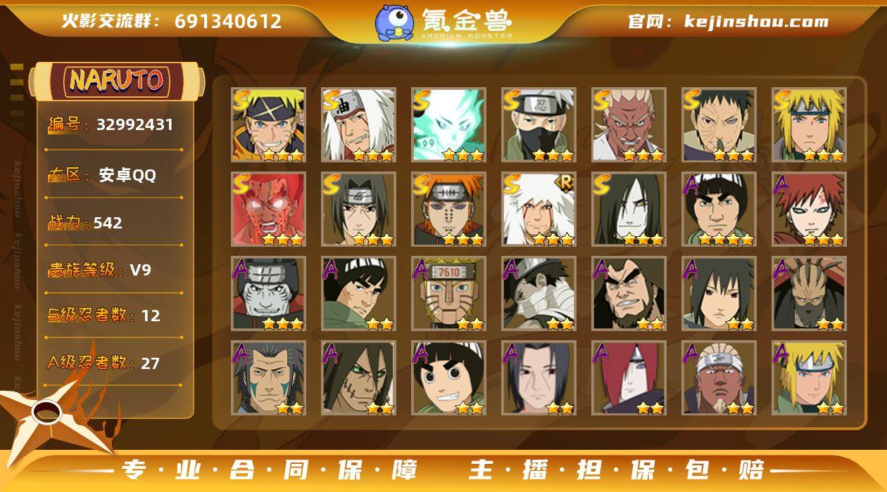 v9 542万战力 12S 27A zp3419 【S级忍者】:宇智波带土「忍界大战」(3星),艾「忍界大战」(3星),宇智波鼬「须佐能乎」(3星),旗木卡卡西「须佐能乎」(3星),自来也「舞之豪杰」(3星),大蛇丸(3星),自来也「传说中的三忍」(3星),波风水门(3星),迈特凯「死门」(3星),佩恩「天道」(3星),大筒木舍人「最终章」(3星),漩涡鸣人·宇智波佐助(3星) 【A级忍者】:艾「青年」(2星),长门「青年」(2星),波风水门「青年」(2星),飞段(2星),飞段「死司凭血」(2星),干柿鬼鲛(3星),机械鸣人「初始形态」(2星),迈特凯(4星),桃地再不斩「秽土转生」(2星),我爱罗「疾风传」(3星),蝎(2星),蝎「绯流琥」(2星),角都「地怨虞」(2星),角都「秽土转生」(2星),猿飞阿斯玛(2星),宇智波鼬「夏日限定」(2星),宇智波佐助「须佐能乎」(2星),宇智波佐助「万花筒写轮眼」(2星),药师兜「半蛇斗篷」(2星),李洛克「忍界大战」(2星),黑土「博人传」(2星),秋道丁次「忍界大战」(2星),千代「近松十人卫」(2星),神农「羁绊」(2星),宇智波泉奈(2星),不动(2星),迈特凯「青春爆炸」(2星)