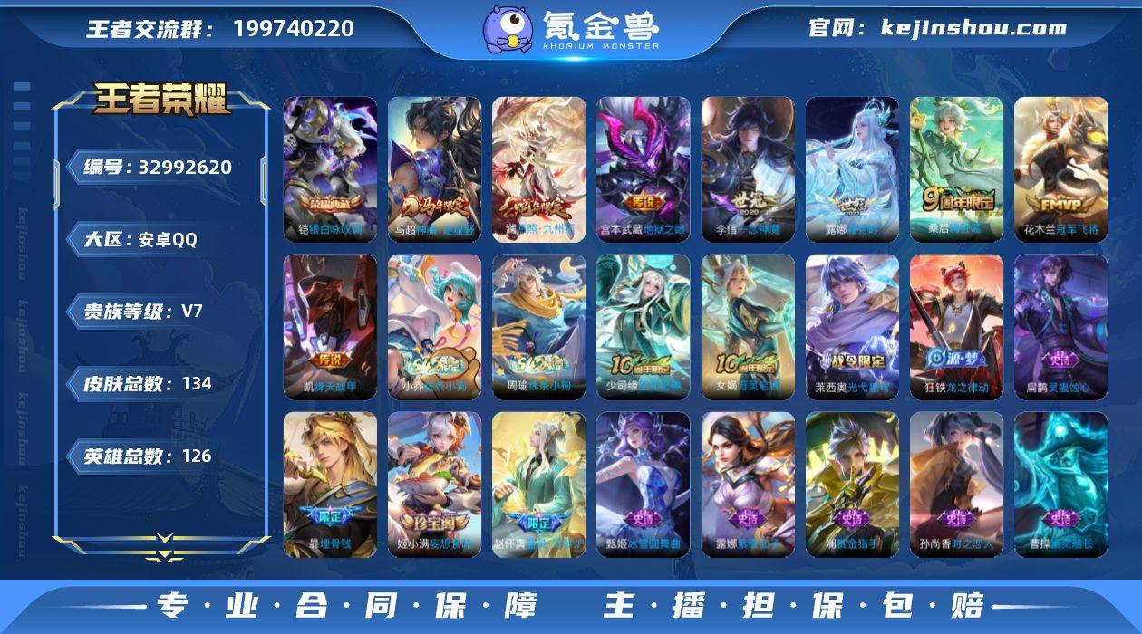 安卓Q-V7-永恒钻石IV段位-126英雄-134皮肤-1典藏皮肤-8传说-36史诗 【英雄全皮】:孙权全皮,敖隐全皮 【荣耀典藏】:铠银白咏叹调 【传说皮肤】:马超神骥逐星野,澜愿照九州拓,桑启鸣野蒿,露娜霜月吟,铠绛天战甲,李信一念神魔,花木兰冠军飞将,宫本武藏地狱之眼 【限定皮肤】:暃埋骨钱,狄仁杰阴阳师,赵云皇家上将,吕布猎兽之王,狄仁杰魔术师,项羽海滩派对,李元芳云中旅人,百里玄策原初追逐者,裴擒虎擒涛扼浪,鲁班大师探海日志,张良古海寻踪,高渐离燃音魔法,妲己灵卜魔法,鬼谷子天穹祈灯,姬小满妄想食味,百里玄策超元猎域 【年限皮肤】:澜愿照九州拓 【赛季限定】:李元芳云中旅人,裴擒虎擒涛扼浪,鲁班大师探海日志,张良古海寻踪,鬼谷子天穹祈灯,东皇太一噬灭天穹,太乙真人谧流熔炉,钟馗虚灵犬护,甄姬逆浪荇歌,亚瑟荣光之誓,百里玄策原初追逐者 【战令限定】:吕布猎兽之王,高渐离燃音魔法,妲己灵卜魔法,莱西奥光弋星穹,明世隐往忆晖光,周瑜线条小狗,小乔线条小狗 【史诗皮肤】:周瑜线条小狗,小乔线条小狗,少司缘巫礼祀神,女娲万灵启世,莱西奥光弋星穹,扁鹊灵蛊蚀心,狂铁龙之律动,赵怀真器灵浮梦炉,暃埋骨钱,百里玄策超元猎...
