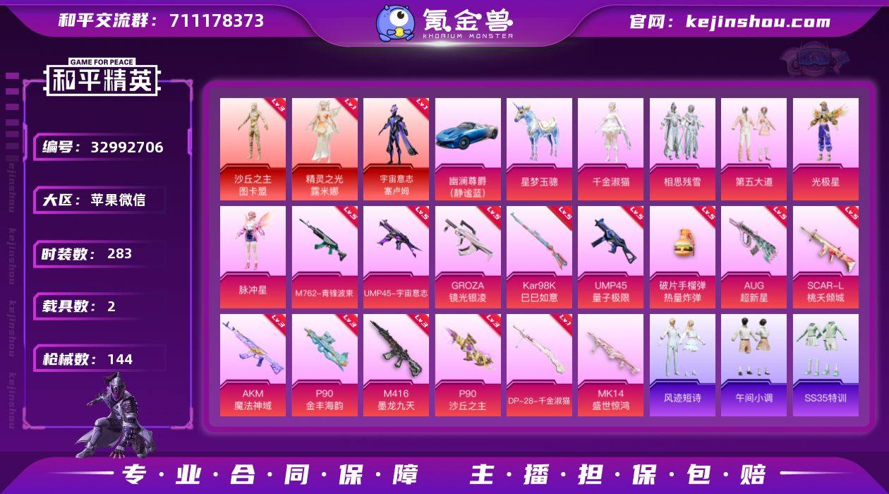 2载具-82套装-144枪皮-3红装2载具5粉装15特效枪3热门82套装144枪皮 55806热力值 10印记 历史绝世王牌25星 【3红装】 精灵之光-露米娜 (1级) 宇宙意志-塞卢姆 (1级) 沙丘之主-图卡盟 (3级) 【2载具】 幽澜尊爵(静谧蓝) 星梦玉骢 【5粉装】 光极星 脉冲星 千金淑猫 第五大道 相思残雪 【15特效枪】 M416-墨龙九天 (3级) AKM-魔法神域 (3级) P90-金丰海韵 (3级) P90-沙丘之主 (3级) UMP45-宇宙意志 (5级) Kar98K-巳巳如意 (5级) M762-青锋波束 (5级) DP-28-千金淑猫 (1级) AUG-超新星 (5级) UMP45-量子极限 (5级) Mk14-盛世惊鸿 (2级) GROZA-镜光银凌 (5级) SCAR-L-桃夭倾城 (5级) ACE32-萌骑漫游 (3级) 破片手榴弹-热量炸弹 (5级) 【3热门】 Mark.06 龟仙人 破蛋小黄鸡 【2飞行器】 龙翔九天飞行器 深渊漩涡飞行器 营地ID: