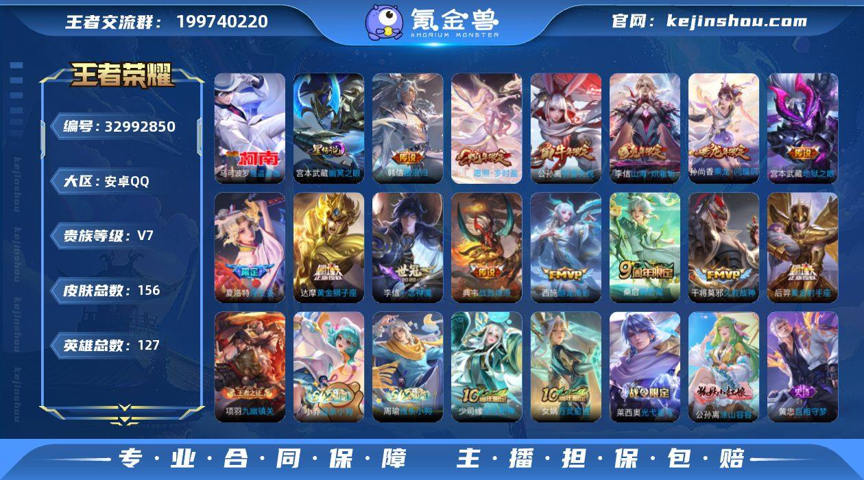 安卓Q-V7-最强王者段位-127英雄-156皮肤-1珍品传说-14传说-49史诗 【英雄全皮】:孙权全皮,夏洛特全皮 【珍品传说】:马可波罗怪盗基德 【传说皮肤】:韩信踏浪归,虞姬愿照岁时盈,桑启鸣野蒿,典韦战鼓燎原,孙尚香乘龙问璇玑,夏洛特浮生妄,李信山海炽霜斩,西施游龙清影,公孙离祈雪灵祝,李信一念神魔,干将莫邪久胜战神,达摩黄金狮子座,后羿黄金射手座,宫本武藏地狱之眼 【限定皮肤】:狄仁杰阴阳师,赵云皇家上将,元歌无心,狄仁杰魔术师,项羽海滩派对,公孙离祈雪灵祝,米莱狄胡桃异想国,李信山海炽霜斩,夏洛特浮生妄,司空震地狱燃心,高渐离燃音魔法,妲己灵卜魔法,鬼谷子天穹祈灯,伽罗琥珀纪元,姬小满妄想食味,孙尚香乘龙问璇玑,沈梦溪龙舞盛年,鲁班七号蔬乡物语,李元芳蔬乡物语,刘邦剑破天穹,程咬金群星魔术团,周瑜熔金海岸 【年限皮肤】:公孙离祈雪灵祝,李信山海炽霜斩,孙尚香乘龙问璇玑,虞姬愿照岁时盈 【赛季限定】:鬼谷子天穹祈灯,刘邦剑破天穹,东皇太一噬灭天穹,太乙真人谧流熔炉,钟馗虚灵犬护,甄姬逆浪荇歌,亚瑟荣光之誓,项羽九幽镇关 【战令限定】:米莱狄胡桃异想国,司空震地狱燃心,高渐离燃音魔法,妲己灵卜魔法,鲁班...