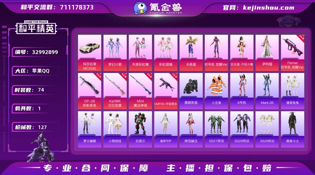 苹果 手Q-7粉装-6特效枪-1载具-5粉色飞行器-38077热力值-3王牌印记-74套装-127枪皮 【热门品类】:粉装-梦幻火箭,套装-小丑鱼,角色-8号机,角色-Mark.06 【粉色套装】:粉装-天使彩虹糖,粉装-梦幻火箭,粉装-彩虹甜喵,角色-光极星,角色-初号机 觉醒Ver.,角色-狂花道·不知火舞,角色-萨利娅 【粉色枪皮等级】:Famas-初号机 觉醒Ver.(五级),UMP45-宇宙意志(三级),Kar98K-巳巳如意(四级),M24-魔法神域(四级),Mk14-福马献瑞(五级),DP-28-豹影疾电(四级) 【粉色载具】:玛莎拉蒂MC20(星石白) 【粉色枪皮】:Famas-初号机 觉醒Ver.,UMP45-宇宙意志,Kar98K-巳巳如意,M24-魔法神域,Mk14-福马献瑞,DP-28-豹影疾电 【粉色飞行器】:梦幻火箭飞行器,星之彼岸飞行器,翩跹演武飞行器,深渊漩涡飞行器,曦光华影飞行器 【粉色降落伞】:甜心宝贝降落伞,梦幻火箭降落伞,齐天大圣降落伞,洛神天依降落伞,精灵梦叶罗丽降落伞,星梦奇缘降落伞,初号机 觉醒Ver.降落伞,忍者神龟降落伞,宇宙意志降落伞,智耀战神降落伞 【稀有套装】:套装-马上有钱,套装-雏菊兔兔,套装-萝兰蝴蝶,套装-小熊娃娃,角色-拉斐尔,套装-晶辉守护,角色-绛羽幽主 【稀有枪皮】:AKM-星之...