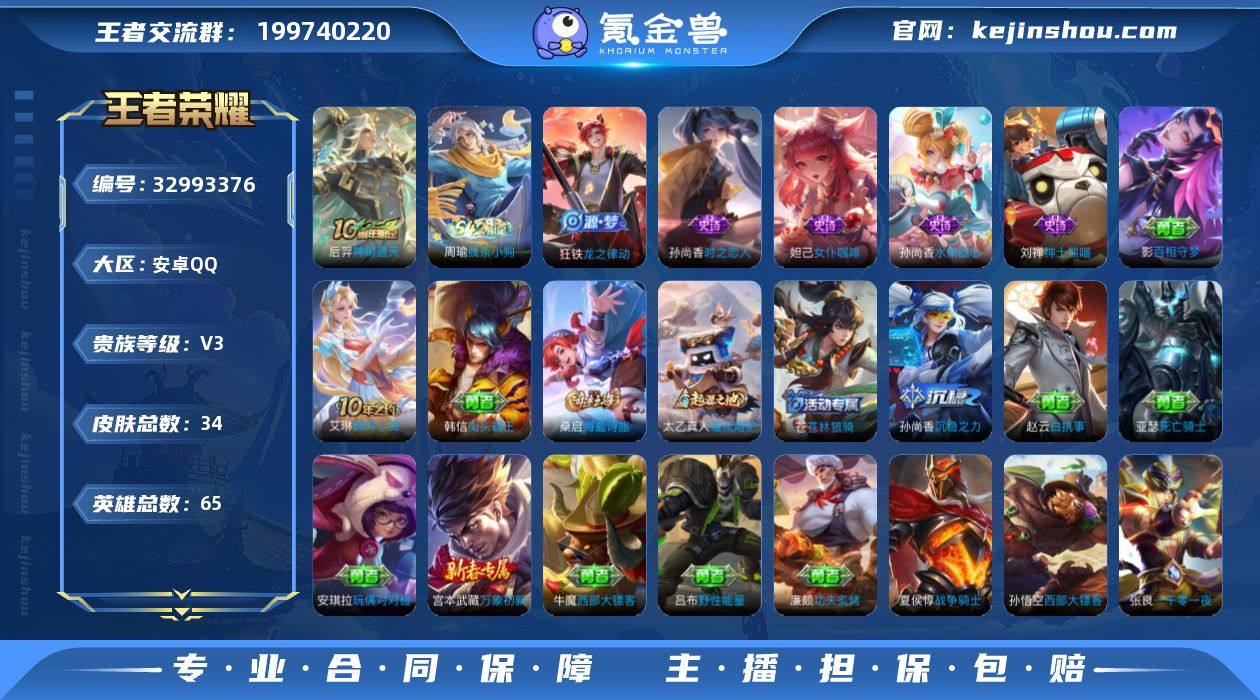 安卓Q-V3-至尊星耀III段位-65英雄-34皮肤-1传说-5史诗 【传说皮肤】:后羿神树通天 【限定皮肤】:桑启海盐诗旅 【赛季限定】:桑启海盐诗旅,太乙真人谧流熔炉 【战令限定】:周瑜线条小狗 【史诗皮肤】:周瑜线条小狗,狂铁龙之律动,孙尚香时之恋人,刘禅绅士熊喵,妲己女仆咖啡,孙尚香水果甜心 【其他皮肤】:影百相守梦,艾琳鹤鸣心笺,太乙真人谧流熔炉,苍苍林狼骑,廉颇功夫炙烤,桑启海盐诗旅,吕布野性能量,孙尚香沉稳之力,宫本武藏万象初新,亚瑟死亡骑士,安琪拉玩偶对对碰,牛魔西部大镖客,赵云白执事,韩信街头霸王,蒙犽归虚梦演,伽罗花见巫女,百里守约绝影神枪,铠龙域领主,夏侯惇战争骑士,虞姬加勒比小姐,刘禅英喵野望,后羿精灵王,孙悟空西部大镖客,张良一千零一夜,钟无艳生化警戒,项羽帝国元帅,鲁班七号福禄兄弟 【营地ID】:1803651153