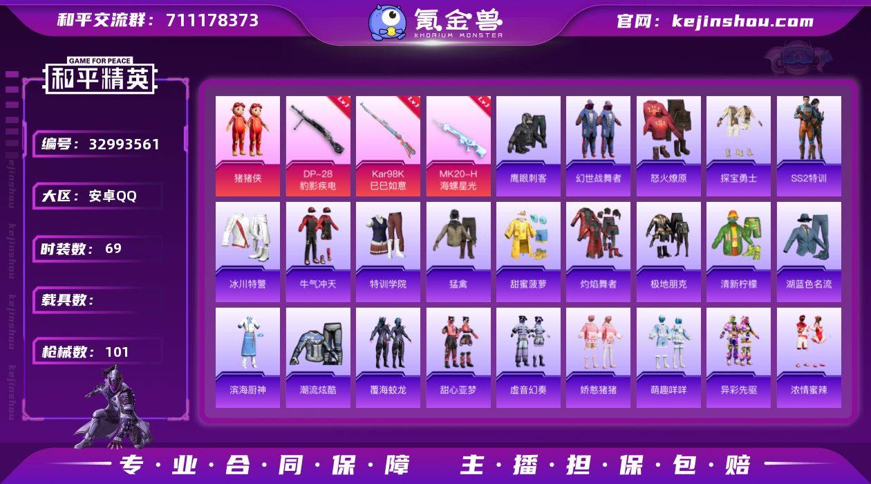 【1粉装3特效枪 可秒换绑不用等】 安卓Q区-28835热力值-69套装-101枪皮 【1粉装】 玩偶服-猪猪侠【3特效枪】 MK20-H-海螺星光(6级) Kar98K-巳巳如意(3级) DP-28-豹影疾电(1级)【25热门】 M416-蓝色火焰 GROZA-异彩先驱 GROZA-彩虹符号 长空猛禽 弄潮海豚 异彩先驱 虚音幻奏 甜心亚梦 牛气冲天 霓虹极客 鹰眼刺客 白色伏地魔 SS25特训 SS22特训 Mk47-洛神天依 SCAR-L-玉兔迎春 GROZA-田园牧歌 Mk47-乌木金纹 UZI-娇憨猪猪 UMP45-蓝色火焰 MG3-幻世战舞者 AKM-虎虎生威【2飞行器】 红色滑翔尾迹 太空嘟嘟飞行器 营地ID:798570309