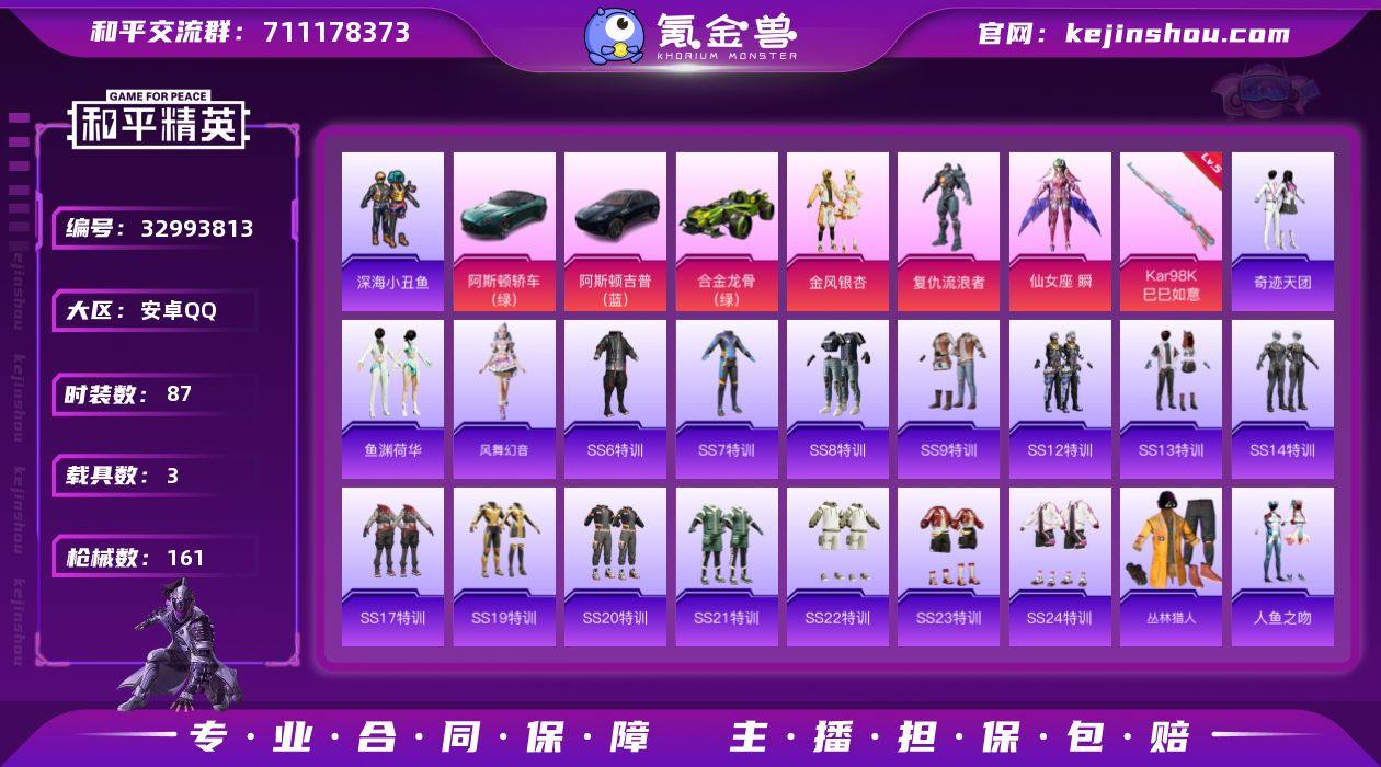 安卓 手Q-3粉装-4特效枪-3载具-0粉色飞行器-47051热力值-2王牌印记-87套装-161枪皮 【热门品类】:套装-深海小丑鱼 【粉色套装】:粉装-金风银杏,角色-复仇流浪者,角色-仙女座 瞬 【粉色枪皮等级】:ACE32-萌骑漫游(四级),AKS-74U-森灵之息(三级),Kar98K-巳巳如意(五级),Mk14-福马献瑞(五级) 【粉色载具】:阿斯顿马丁DBS(绿),阿斯顿马丁DBX(蓝),合金龙骨(绿) 【粉色枪皮】:ACE32-萌骑漫游,AKS-74U-森灵之息,Kar98K-巳巳如意,Mk14-福马献瑞 【粉色降落伞】:星之信仰降落伞,龙虾霸霸降落伞,炫紫旋律降落伞,甜蜜誓约降落伞,香水柠檬降落伞,橘柚倾心降落伞,星穹咏叹调降落伞,辉云木星降落伞,小舞降落伞 【稀有套装】:套装-马上有钱,套装-迅捷龙虾,套装-鱼渊荷华,套装-风舞幻音,套装-雨过天青,套装-红釉青花,角色-霜纹水星,角色-曹焱兵 【稀有枪皮】:AKM-夜灯,AKM-玉龙,AKM-破晓战魂,AKM-龙的传人,M16A4-幻世战舞者,M16A4-快乐主宰,M16A4-甜心亚梦,M16A4-红色方程式,M16A4-蓝色火焰,SCAR-L-炫彩节奏,SCAR-L-玉兔迎春,SCAR-L-红色方程式,M416-夜灯,M416-红色方程式,M416-蓝色火焰,AUG-耀粉歌者,AUG-青春冒险家,QBZ-妙趣可丽,...