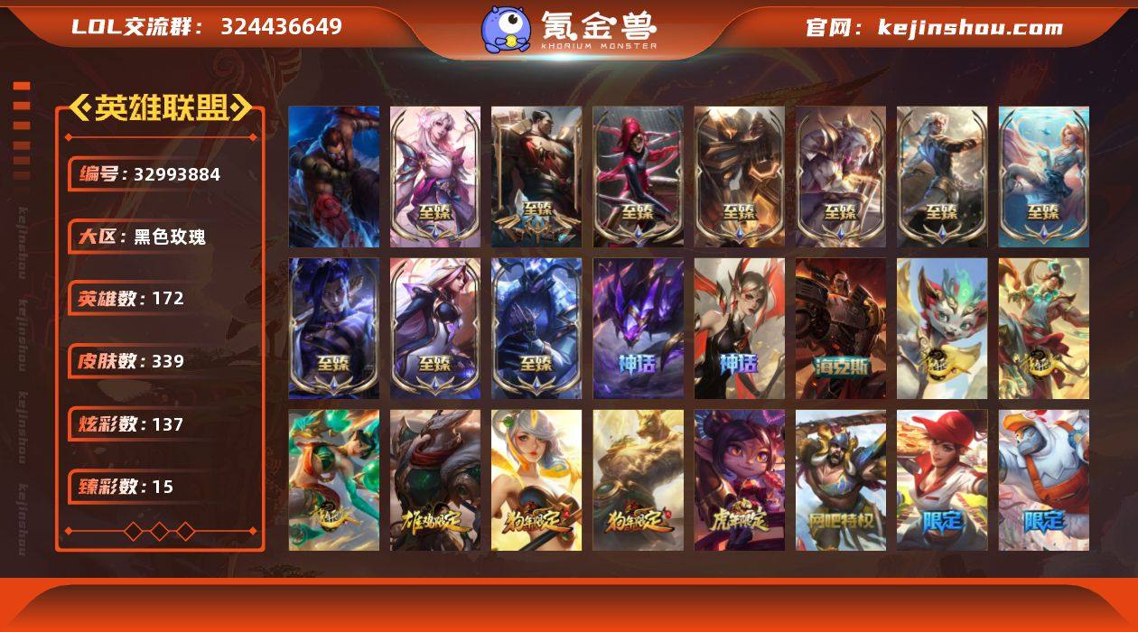 铂金段位-172英雄-339皮肤-137炫彩-1终极-15神话-58限定-37传说-39史诗 【珍稀头像】:至爱的鹿头像 【神话皮肤】:殿堂传奇乐芙兰,水晶掠夺者卡兹克 【至臻皮肤】:至臻绝息圣堂厄运小姐,至臻蒙面女郎莫甘娜,至臻黑色玫瑰假面舞会卡特琳娜,至臻王国机神玄武盖伦,至臻灵魂莲华拉克丝,至臻凯旋将军德莱厄斯,至臻女帝黛安娜,至臻黑夜使者凯隐,至臻海之歌萨勒芬妮,至臻DRX亚托克斯,至臻T1塞拉斯,至臻至高天奎桑提 【海克斯皮肤】:恐惧新星德莱厄斯 【臻彩皮肤】:天龙之子迦娜云起龙骧,天龙之子卡莎飞龙乘云,无畏骑士瑟庄妮赤子初心,赵云子龙炫金将军,冠军之隐劫凯旋圣装,雾雨之刃锐雯,花仙子拉克丝纹白,玉剑传说无极麒麟,源计划联合艾希红莲之弓,源计划火菲奥娜惩戒,霸天异形卡兹克刹那银光,可爱可爱粉红红布里茨,殿堂传奇乐芙兰登神,魔女阿卡丽虚荣,净雪之月莫甘娜冬虹 【年限皮肤】:司马懿仲达,北辰之威内瑟斯,春晖神女拉克丝,虎头虎脑崔丝塔娜,天龙之子李青,天龙之子卡莎,天龙之子斯莫德,点心宝贝阿木木 【情人节限定】:甜心宝贝娑娜,觅心猎手薇恩,觅心猫猫悠米,幽梦玫瑰泰隆,水晶玫瑰斯维因 【冰雪限定】:圣诞开心鬼提莫,圣诞狂...