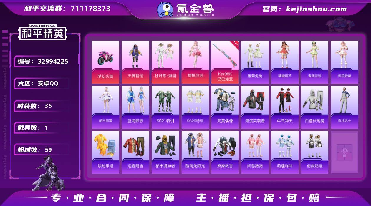 【8452】3粉装-3特效枪-1载具-0粉色飞行器-17443热力值-1王牌印记-35套装-59枪皮 【粉色套装】:粉装-天禅智恒,粉装-牡丹亭·游园,角色-樱桃泡泡 【粉色枪皮等级】:Kar98K-巳巳如意(一级),Mk14-福马献瑞(一级),PKM-萌骑夺宝(四级) 【粉色载具】:双人摩托-梦幻火箭