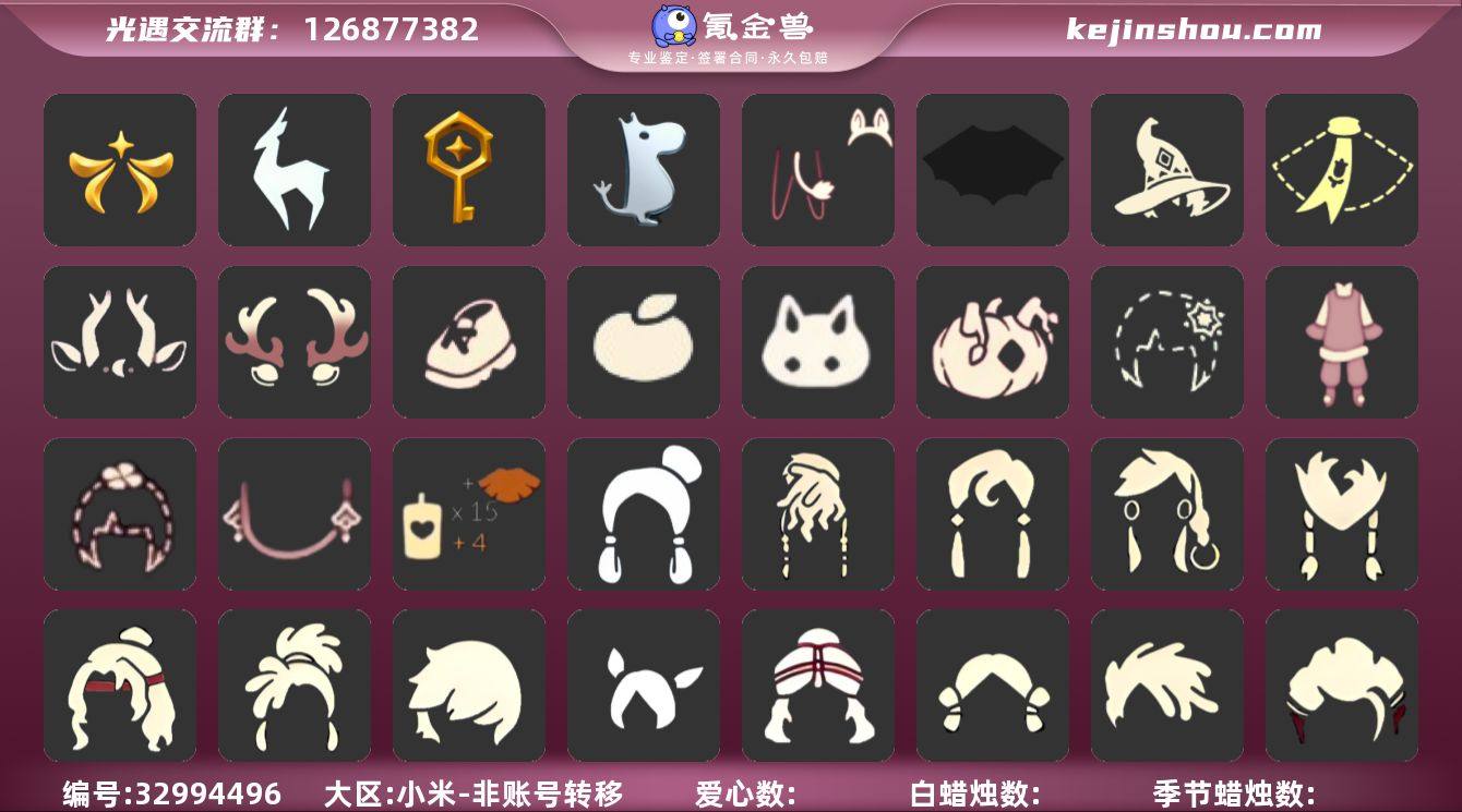 区服:小米服登入方式:手机蜡烛数量:33爱心:128当前身高12.777最高身高0.963最矮身高12.963已经毕业地图:雨林,霞谷已经毕业季节:姆明季,筑巢季,九色鹿季,欧若拉季'半二重奏季稀有礼包:祥云瑞气服饰,跃动跑鞋,神鹿祝福头饰,金鳞耳坠,圣诞鹿角,姆明饰品套装,巫师帽,雪花发卡,玉兔,大桔大利,四叶草头饰,创始人礼包,小王子围巾,蝙蝠斗篷,冥龙南瓜热门物品:蝴蝶结,公主头,正太头,樱花头,猫猫头,搓澡巾,武士裤,白棉裤,花环头饰,宴会围巾,虚荣发型,红耳机,黄鼠狼面具,花瓣斗篷,红金斗篷,白金斗篷,吉他,高音钢琴,笛子,铃铛