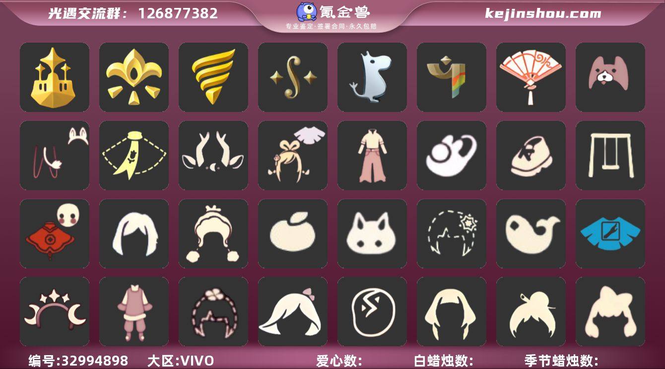 【lyg32】区服:VIVO服'登入方式:手机'蜡烛数量:1277爱心:109当前身高2.507最高身高0.985最矮身高12.985已经毕业3地图:晨岛,云野,雨林,霞谷,暮土,禁阁'已经毕业季节:彩染季,姆明季,二重奏季,潜海季,集结季,梦想季'半夜行季'半归巢季'半九色鹿季'半青鸟季'有预言季卡'稀有礼包:祥云瑞气服饰,阔腿牛仔裤,玉兔拖鞋,跃动跑鞋,星月头冠,神鹿祝福头饰,金鳞耳坠,姆明饰品套装,奔离远行发型,鲤鱼龙门,多彩绒绒帽,绊爱套装,渐变双马尾发型,雪花发卡,玉兔,大桔大利,年年有余,四叶草头饰,小狗周年头饰,tgc,小王子围巾,新春福娃,献瑞折扇礼包,情人秋千'热门物品:蝴蝶结,正太头,樱花头,猫猫头,搓澡巾,武士裤,白棉裤,背带裤,花环头饰,宴会围巾,虚荣发型,红耳机,红狐狸面具,花瓣斗篷,红金斗篷,白金斗篷,白鸟斗篷,吉他,尤克里里,高音钢琴,笛子,排箫,雨伞