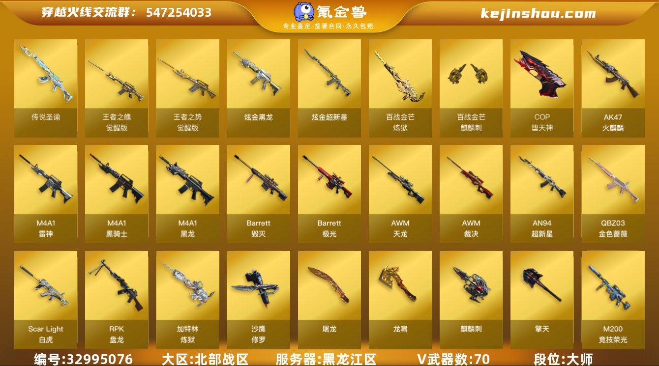 【ky6755】黑龙江区-81V-5王者武器数-2炫金武器数 【传说武器】:传说圣谕 【传说角色】:传说艾莉莎 【热门武器】:传说圣谕,QBZ03-金色蔷薇,Scar Light-白虎,M200-竞技荣光,死亡之眼,炼狱-迷你小钢,M4A1-黑骑士,RPK-盘龙,加特林-炼狱*4,斯泰尔-蝴蝶,USP-雷暴,COP-堕天神,沙鹰-修罗*5,金刚伞 【王者炫金武器】:王者冰锋,炫金黑龙,炫金超新星 【音效卡】:AK47-火麒麟音效卡,Barrett-毁灭音效卡,Barrett-碧霄极光音效卡,炼狱-百战金芒-庆典舞曲音效卡,死神-雪域霜狐-怀旧音效卡 【皮肤】:QBZ03-AG-CFPLS19冠军,裁决-星际旅行 皮肤,雷神-暗月,雷神-能量核心*2,雷神-星空,雷神-诺拉 皮肤,雷神-紫凛 皮肤,火麒麟-雷神,火麒麟-白虎,火麒麟-百城,火麒麟-大唐荣光,火麒麟-心动糖果,毁灭-暗月,毁灭-荣耀之怒,毁灭耀金皮肤,毁灭-星空,毁灭-黑大圣皮肤,毁灭-神秘黑洞皮肤,毁灭-黑曼巴 皮肤,黑龙-暗月,黑骑士-暗月*2,无影-暗月*2,无影-神兵利器 皮肤,死神-秘银,天启-暗月*3,天龙-能量核心,AWM-天龙-传奇白鲨,极光-能量核心*2,修罗-能量核心,修罗-冠军之魂,天神-暗月,屠龙-荣耀之锋*2,屠龙-春桃 皮肤,龙啸-醒狮 皮肤,龙啸-青青莓...