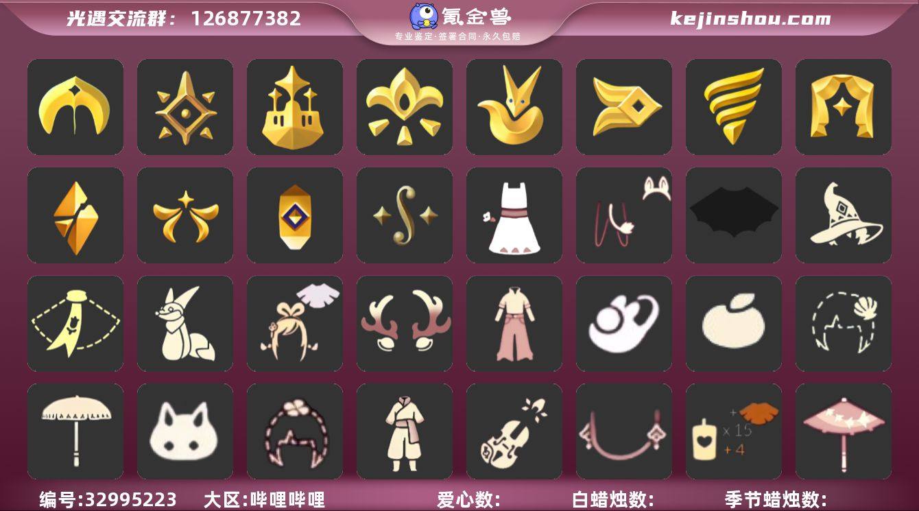区服:bibi登入方式:手机蜡烛数量:348爱心:4最高身高0.326最矮身高12.326已经毕业地图:晨岛,云野,雨林,霞谷,暮土,禁阁已经毕业季节:二重奏季,追忆季,欧若拉季,破晓季,表演季,潜海季,风行季,王子季,集结季,梦想季,预言季,圣岛季稀有礼包:彩虹武士裤,阔腿牛仔裤,向日葵连衣裙,玉兔拖鞋,彩虹耳饰,金鳞耳坠,日光耳环,圣诞鹿角,姆明饰品套装,巫师帽,南瓜头,绊爱套装,贝壳,玉兔,大桔大利,四叶草头饰,锦标赛桂冠,创始人礼包,小王子围巾,蝙蝠斗篷,遥鲲披肩斗篷,阳伞,凯旋提琴,飞鸟纸伞,狐狸背包热门物品:阿努比斯,蝴蝶结,公主头,正太头,樱花头,猫猫头,搓澡巾,武士裤,白棉裤,背带裤,花环头饰,宴会围巾,虚荣发型,红耳机,黄鼠狼面具,红狐狸面具,花瓣斗篷,灯泡斗篷,红金斗篷,白金斗篷,白鸟斗篷,吉他,尤克里里,高音钢琴,笛子,排箫,铃铛,雨伞